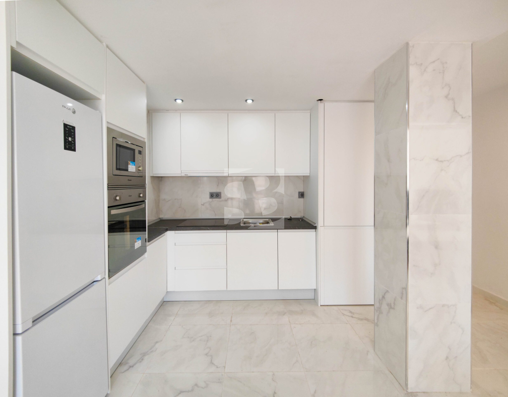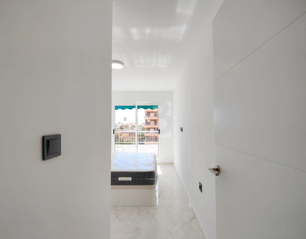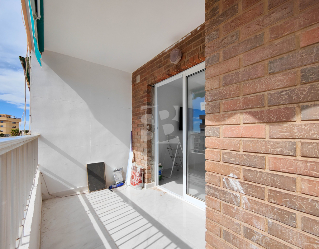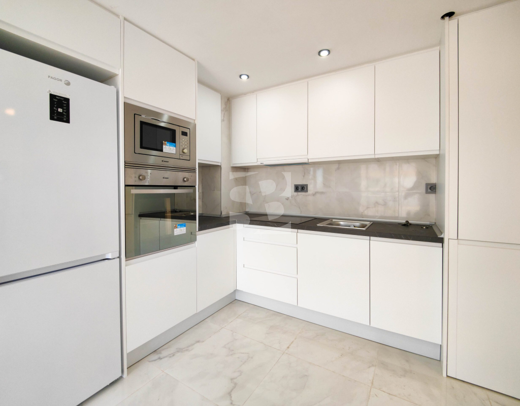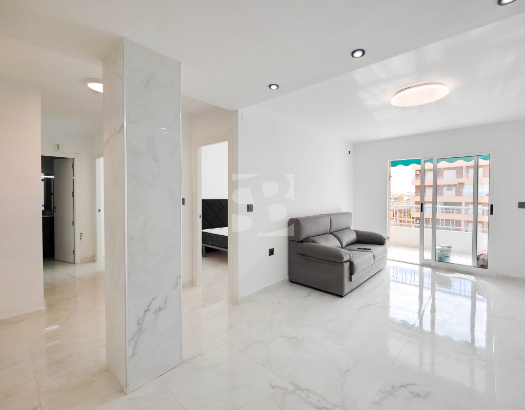 Beautiful completely renovated south facing apartment with views over the swimming pool for sale in Rocío del Mar - Punta Prima - Torrevieja. Located in a building with elevator, covered and fenced parking for residents and a huge communal swimming pool with lifeguard. Very well kept building, recently reinforced. This wonderful apartment has been completely renovated, including electrical installation and plumbing, ready to move into.The apartment has 2 large bedrooms with fitted wardrobes and access to the terrace, 2 bathrooms (both with shower), a bright living / dining room with a beautiful brand new integrated kitchen. The bedrooms and the terrace enjoy an excellent SOUTH orientation, which gives them a lot of natural light. From the terrace we have unobstructed views over the communal pool, ideal for keeping an eye on the children. Privileged location, a few steps from the bars, restaurants, supermarkets and the beaches of Punta Prima. Do not miss the opportunity to buy this beautiful completely renovated south facing apartment with the best orientation and on the best location in Punta Prima!