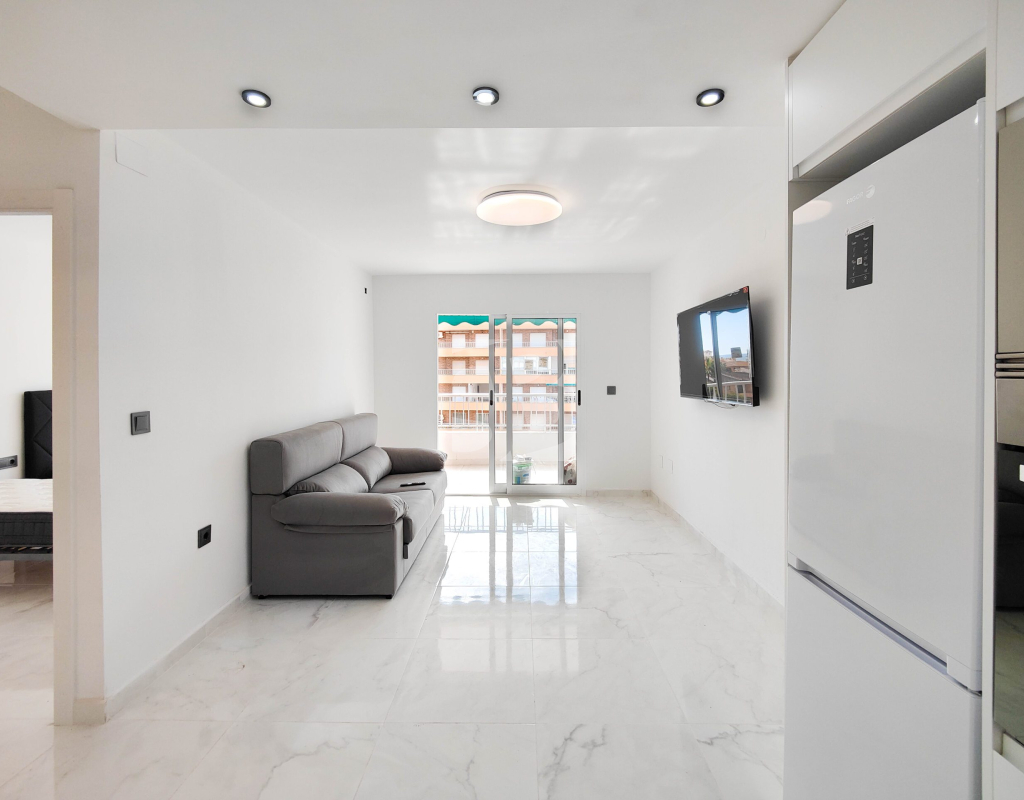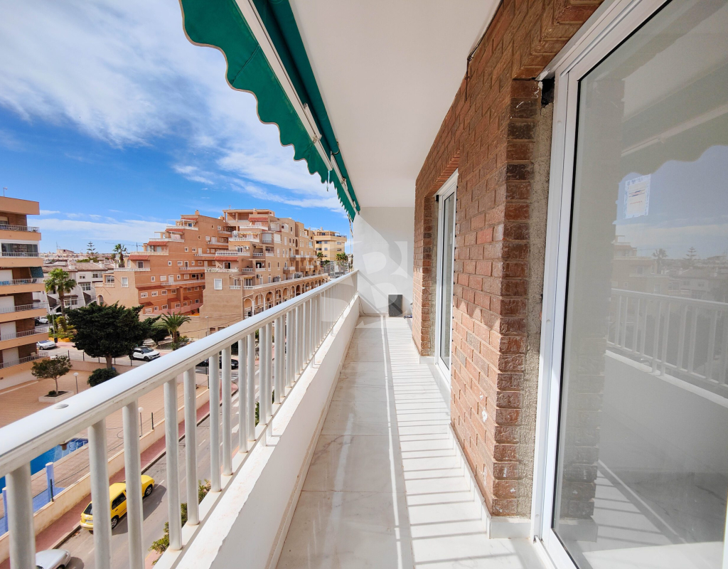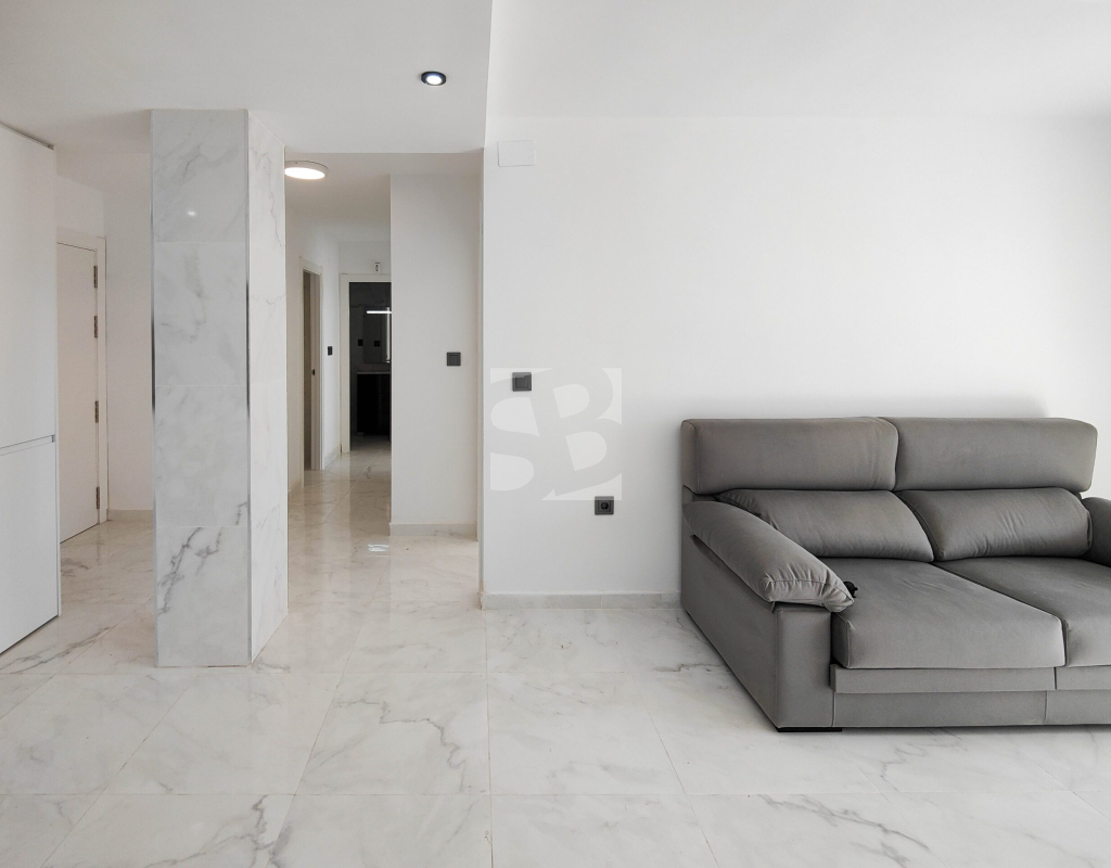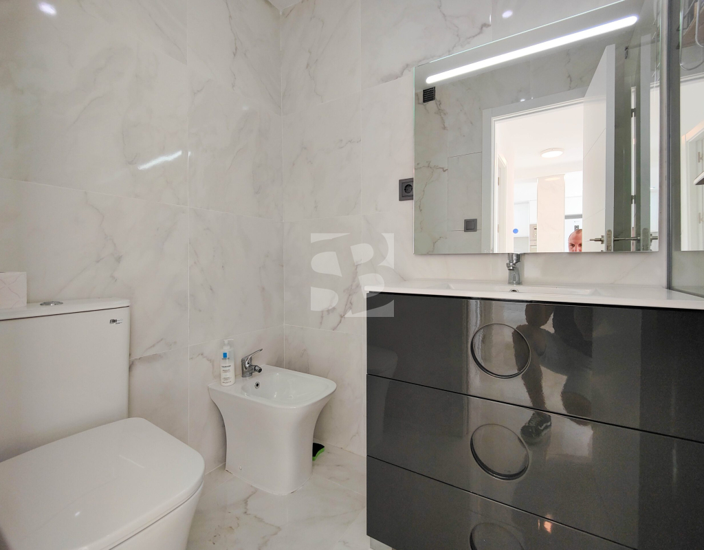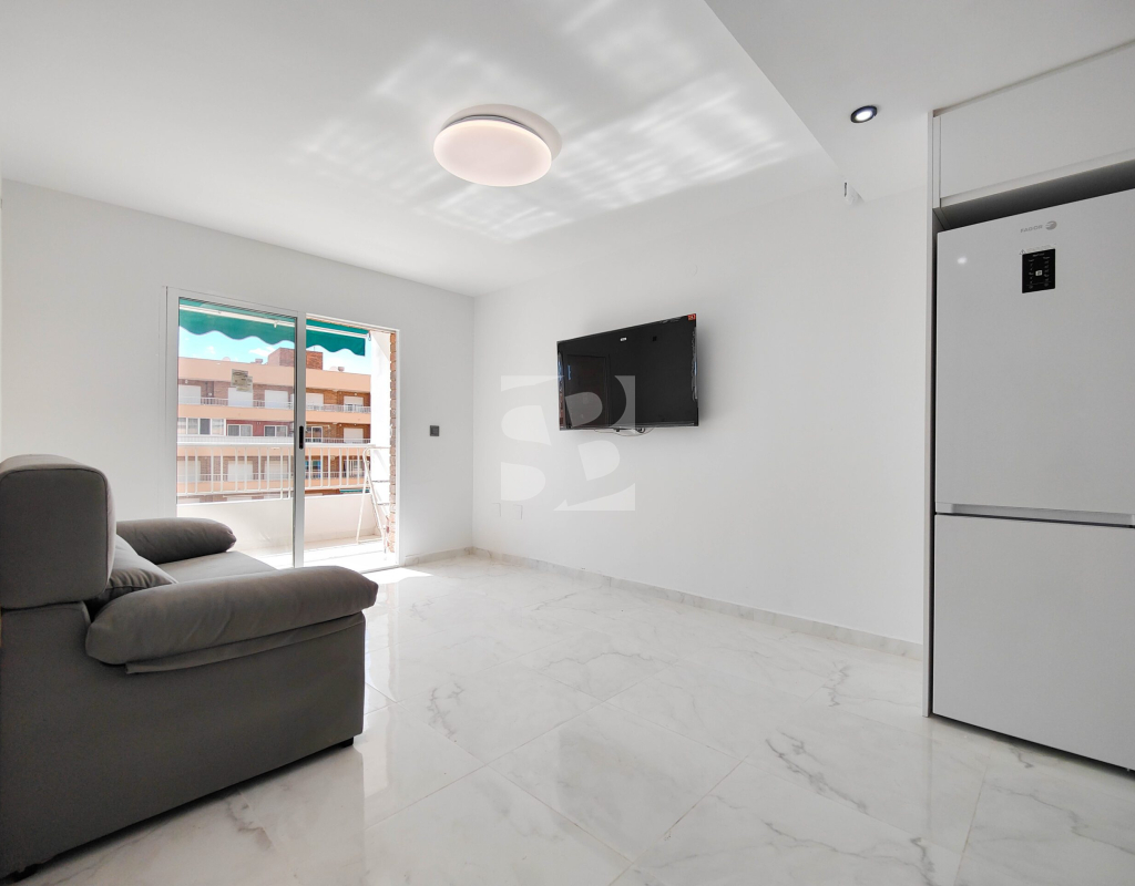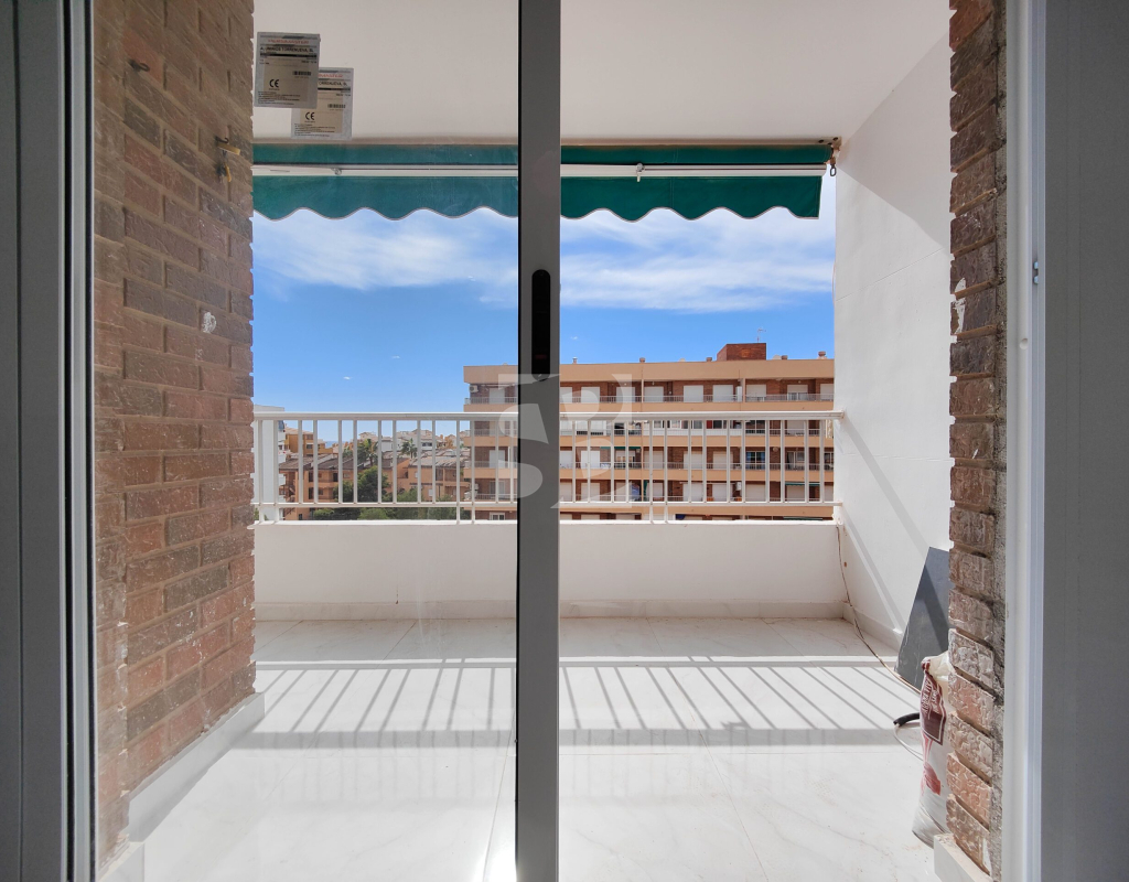 Beautiful completely renovated south facing apartment with views over the swimming pool for sale in Rocío del Mar - Punta Prima - Torrevieja. Located in a building with elevator, covered and fenced parking for residents and a huge communal swimming pool with lifeguard. Very well kept building, recently reinforced. This wonderful apartment has been completely renovated, including electrical installation and plumbing, ready to move into.The apartment has 2 large bedrooms with fitted wardrobes and access to the terrace, 2 bathrooms (both with shower), a bright living / dining room with a beautiful brand new integrated kitchen. The bedrooms and the terrace enjoy an excellent SOUTH orientation, which gives them a lot of natural light. From the terrace we have unobstructed views over the communal pool, ideal for keeping an eye on the children. Privileged location, a few steps from the bars, restaurants, supermarkets and the beaches of Punta Prima. Do not miss the opportunity to buy this beautiful completely renovated south facing apartment with the best orientation and on the best location in Punta Prima!
