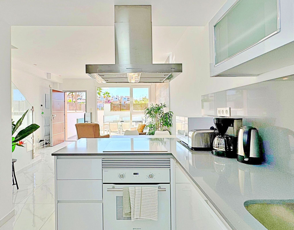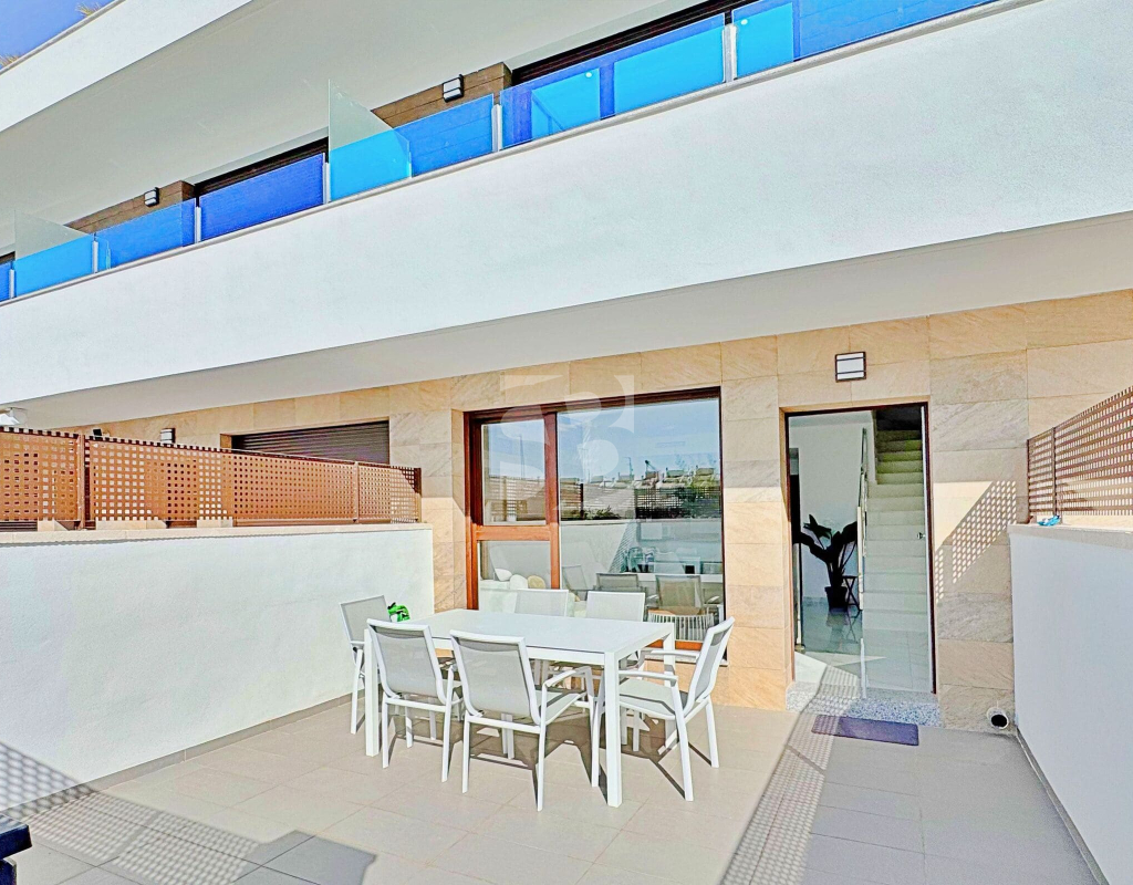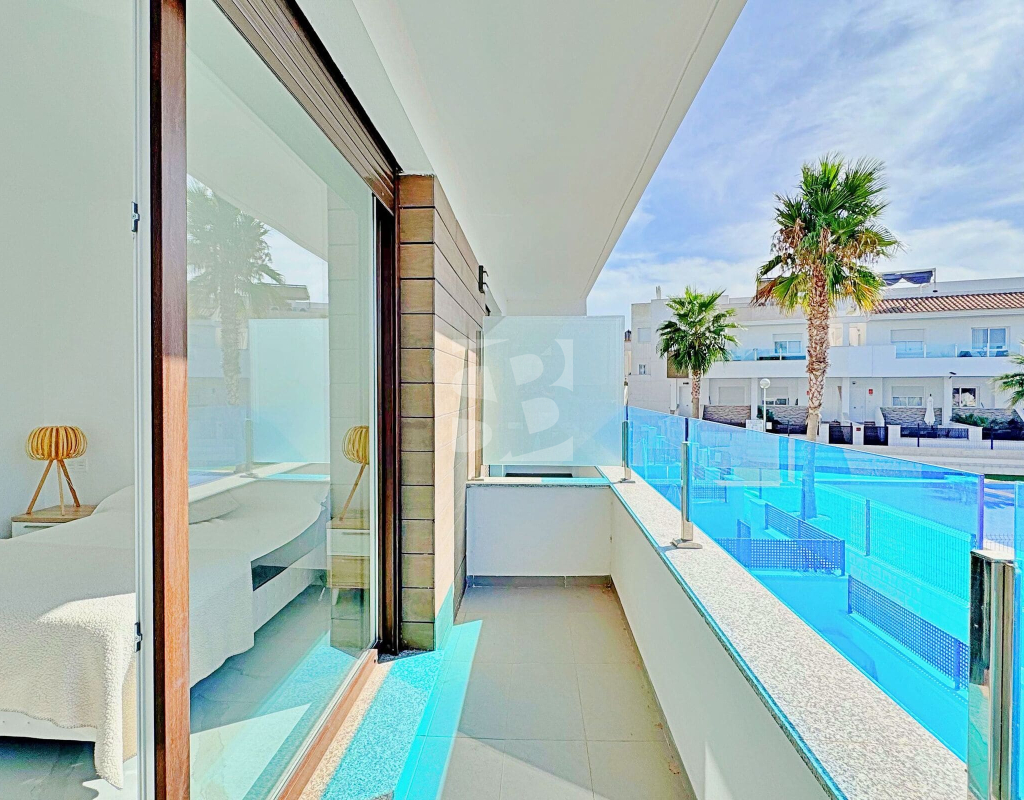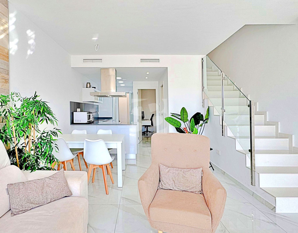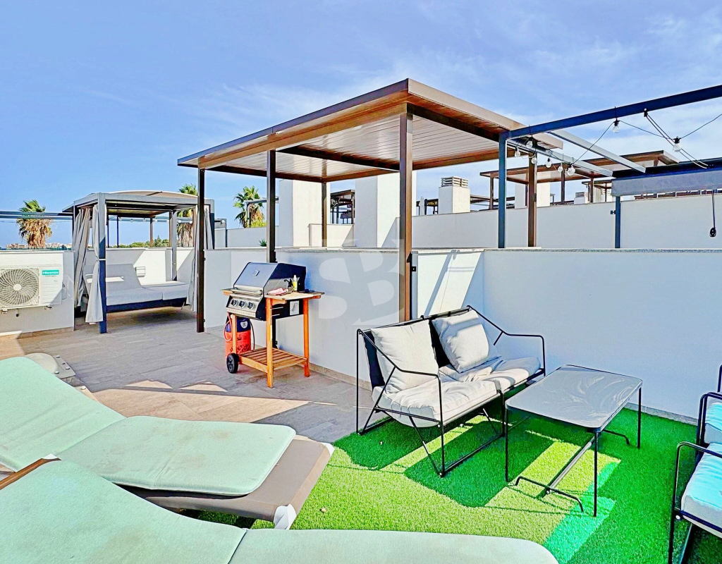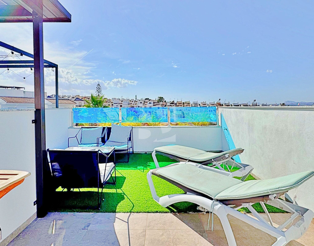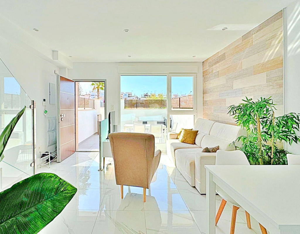 This three-bedroom, three-bathroom duplex townhouse is located in the exclusive residential area of Los Balcones in Torrevieja. The property stands out for its modern design, bright interiors and spacious terraces that allow you to enjoy the Mediterranean lifestyle all year round. On the ground floor, the house features a private 22 m² garden with space for outdoor dining. Inside, there is an open-plan living room with an elegant feature wall, connected to a fully equipped modern kitchen with appliances and breakfast bar. This level also includes a bedroom with fitted wardrobes, currently adapted as a study, and a complete bathroom with shower. Upstairs, there are two further bedrooms, both with fitted wardrobes. The master bedroom is particularly bright and has direct access to a private terrace with views of the residential area and the swimming pool. This floor also offers two additional bathrooms with modern finishes. The property also benefits from a large private solarium with open views of the Torrevieja lagoon, equipped with a chill-out area, pergola, barbecue and sun loungers — perfect for outdoor gatherings or simply relaxing in a peaceful setting. The residential complex offers large communal areas with a swimming pool surrounded by palm trees and green spaces, creating an ideal environment for families or those seeking a relaxed lifestyle. Los Balcones is one of the most established residential areas of Torrevieja, with all services nearby: supermarkets, schools, pharmacies, sports facilities and Torrevieja University Hospital. The beaches of Punta Prima and Torrevieja are less than 4 km away, making this property an excellent choice both as a permanent residence or a holiday investment.