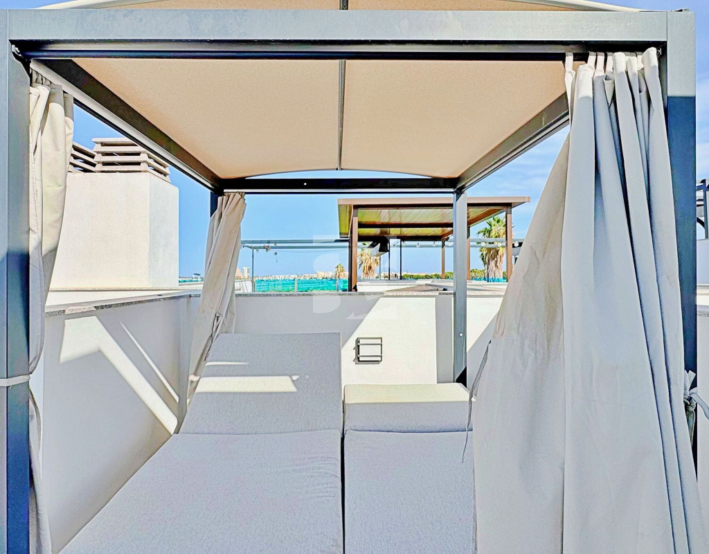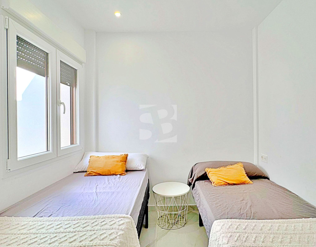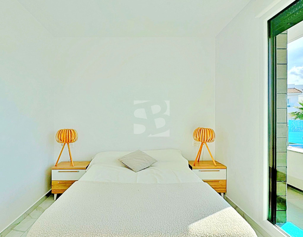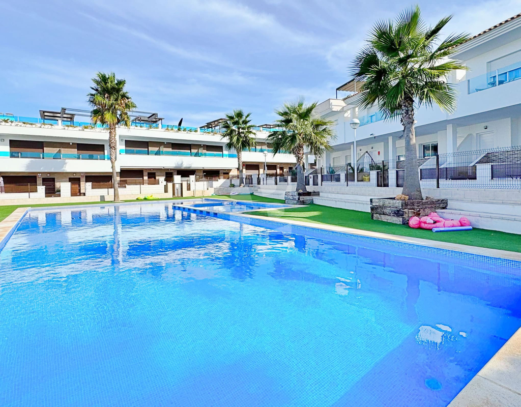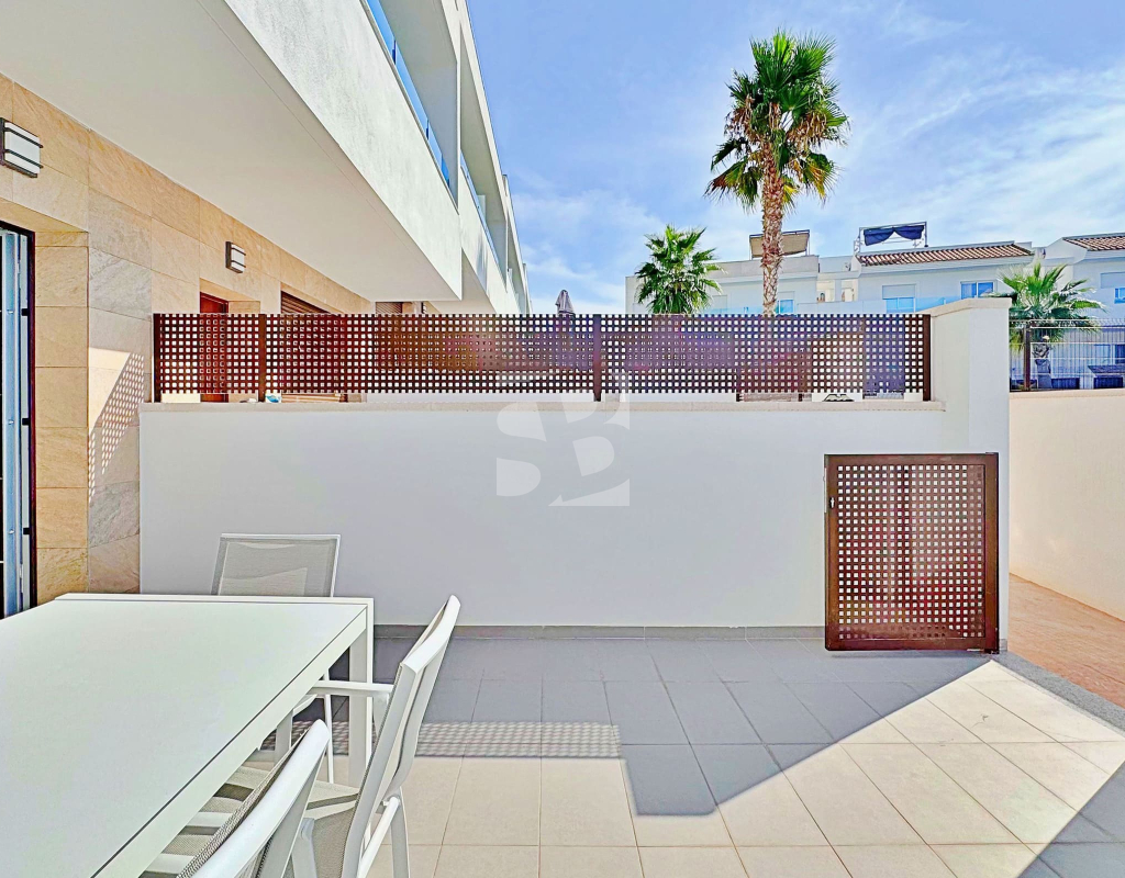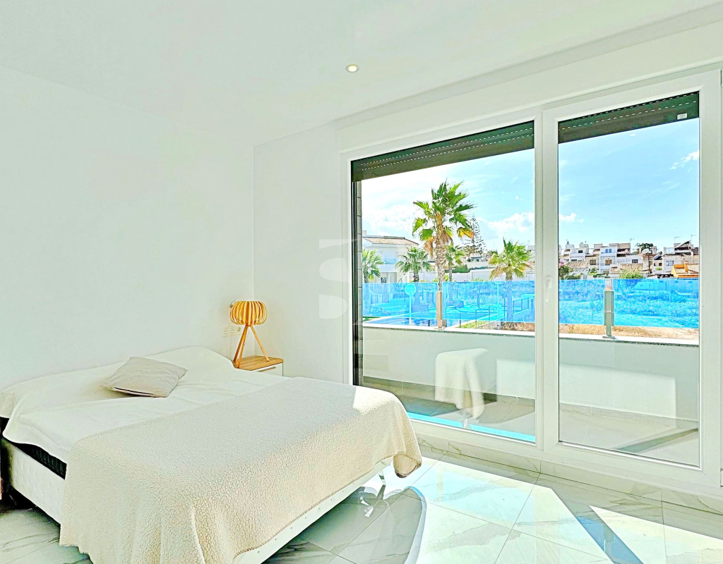 This three-bedroom, three-bathroom duplex townhouse is located in the exclusive residential area of Los Balcones in Torrevieja. The property stands out for its modern design, bright interiors and spacious terraces that allow you to enjoy the Mediterranean lifestyle all year round. On the ground floor, the house features a private 22 m² garden with space for outdoor dining. Inside, there is an open-plan living room with an elegant feature wall, connected to a fully equipped modern kitchen with appliances and breakfast bar. This level also includes a bedroom with fitted wardrobes, currently adapted as a study, and a complete bathroom with shower. Upstairs, there are two further bedrooms, both with fitted wardrobes. The master bedroom is particularly bright and has direct access to a private terrace with views of the residential area and the swimming pool. This floor also offers two additional bathrooms with modern finishes. The property also benefits from a large private solarium with open views of the Torrevieja lagoon, equipped with a chill-out area, pergola, barbecue and sun loungers — perfect for outdoor gatherings or simply relaxing in a peaceful setting. The residential complex offers large communal areas with a swimming pool surrounded by palm trees and green spaces, creating an ideal environment for families or those seeking a relaxed lifestyle. Los Balcones is one of the most established residential areas of Torrevieja, with all services nearby: supermarkets, schools, pharmacies, sports facilities and Torrevieja University Hospital. The beaches of Punta Prima and Torrevieja are less than 4 km away, making this property an excellent choice both as a permanent residence or a holiday investment.