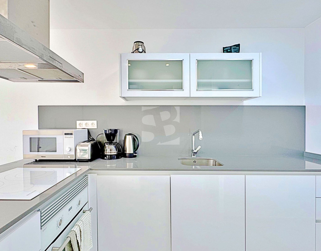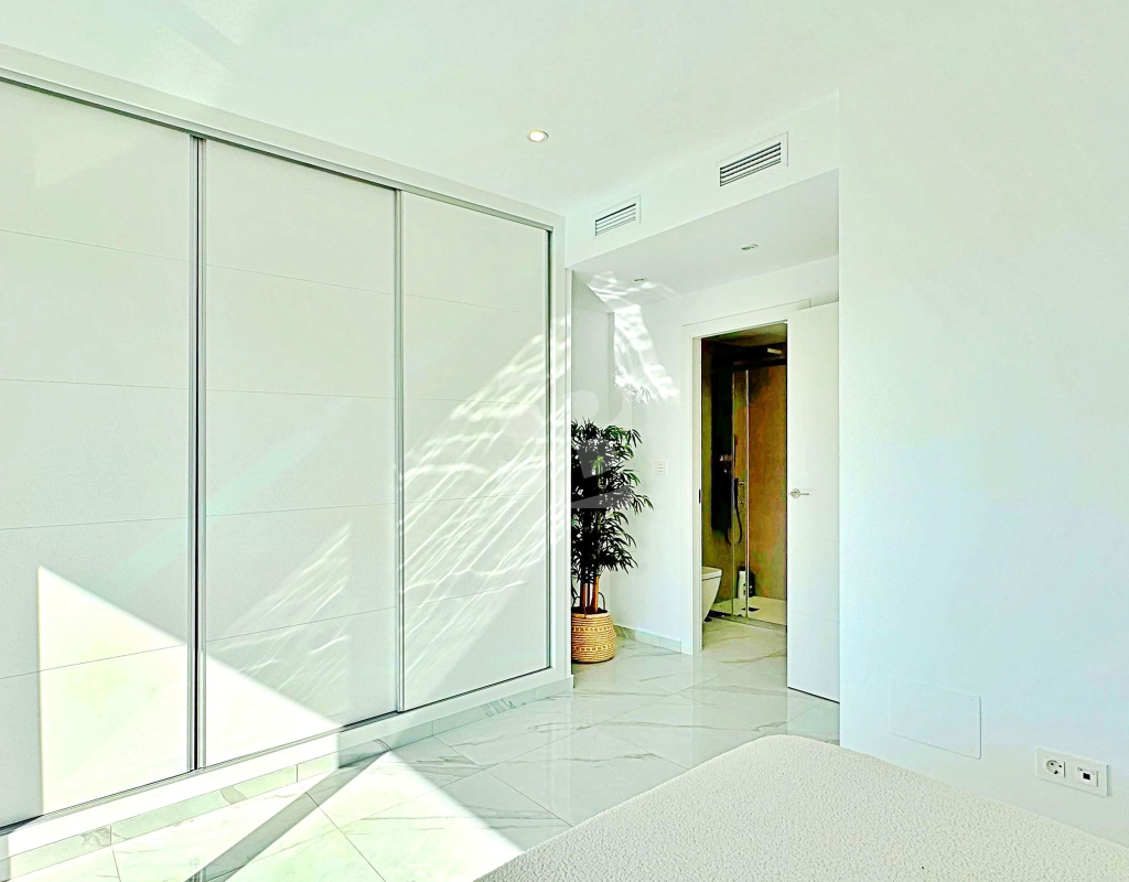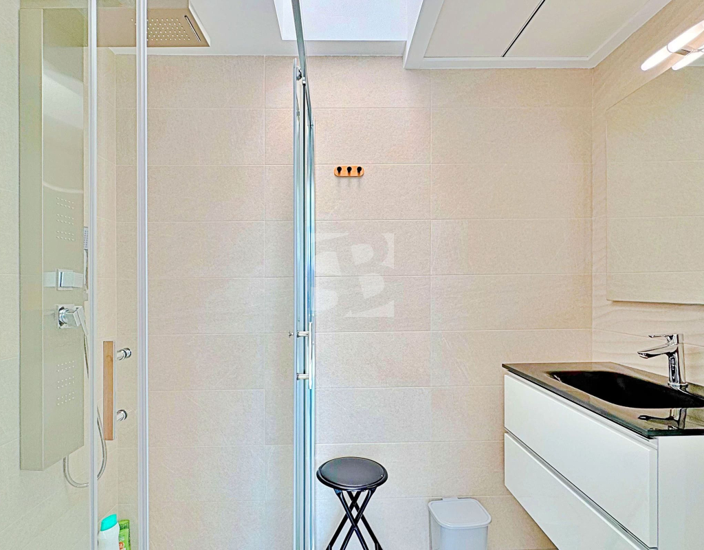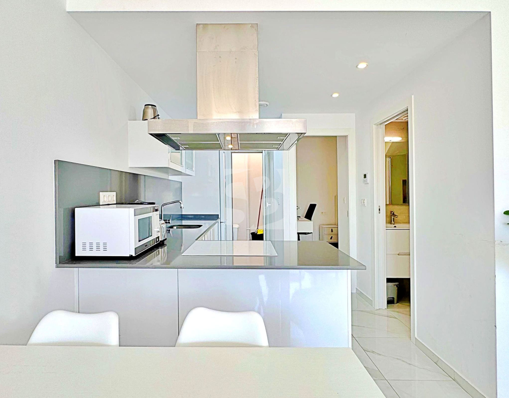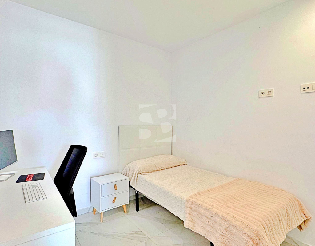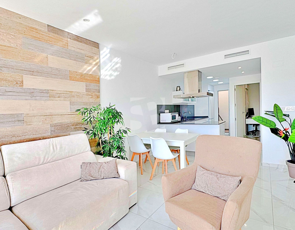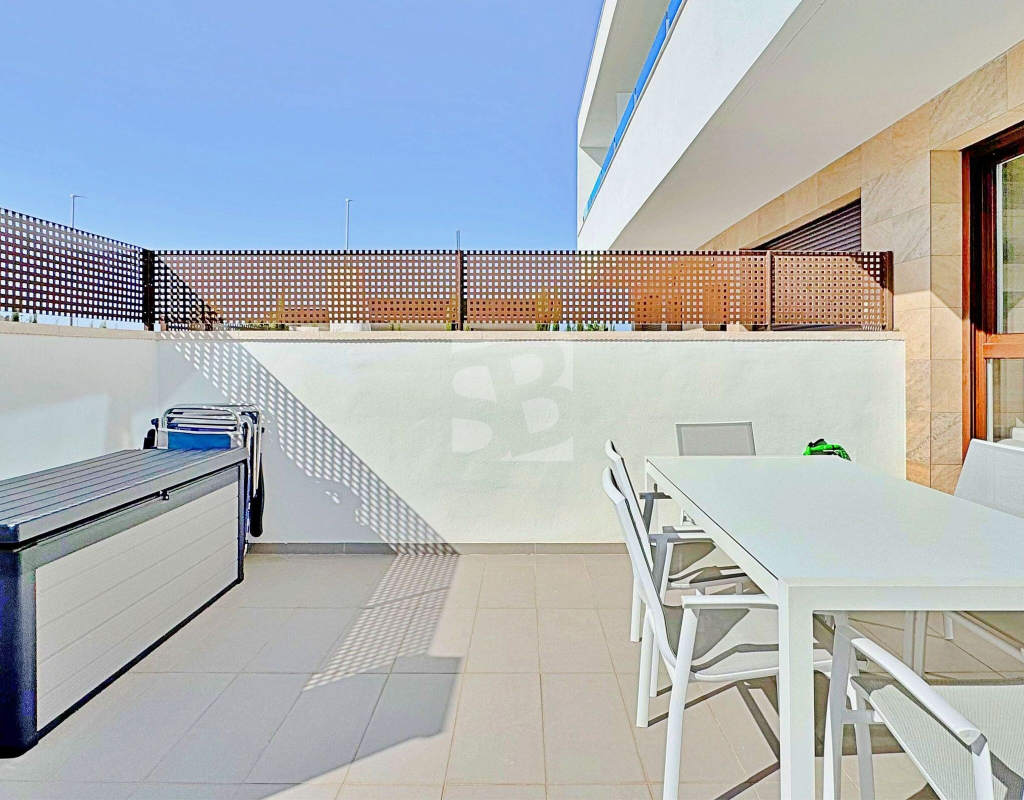 This three-bedroom, three-bathroom duplex townhouse is located in the exclusive residential area of Los Balcones in Torrevieja. The property stands out for its modern design, bright interiors and spacious terraces that allow you to enjoy the Mediterranean lifestyle all year round. On the ground floor, the house features a private 22 m² garden with space for outdoor dining. Inside, there is an open-plan living room with an elegant feature wall, connected to a fully equipped modern kitchen with appliances and breakfast bar. This level also includes a bedroom with fitted wardrobes, currently adapted as a study, and a complete bathroom with shower. Upstairs, there are two further bedrooms, both with fitted wardrobes. The master bedroom is particularly bright and has direct access to a private terrace with views of the residential area and the swimming pool. This floor also offers two additional bathrooms with modern finishes. The property also benefits from a large private solarium with open views of the Torrevieja lagoon, equipped with a chill-out area, pergola, barbecue and sun loungers — perfect for outdoor gatherings or simply relaxing in a peaceful setting. The residential complex offers large communal areas with a swimming pool surrounded by palm trees and green spaces, creating an ideal environment for families or those seeking a relaxed lifestyle. Los Balcones is one of the most established residential areas of Torrevieja, with all services nearby: supermarkets, schools, pharmacies, sports facilities and Torrevieja University Hospital. The beaches of Punta Prima and Torrevieja are less than 4 km away, making this property an excellent choice both as a permanent residence or a holiday investment.