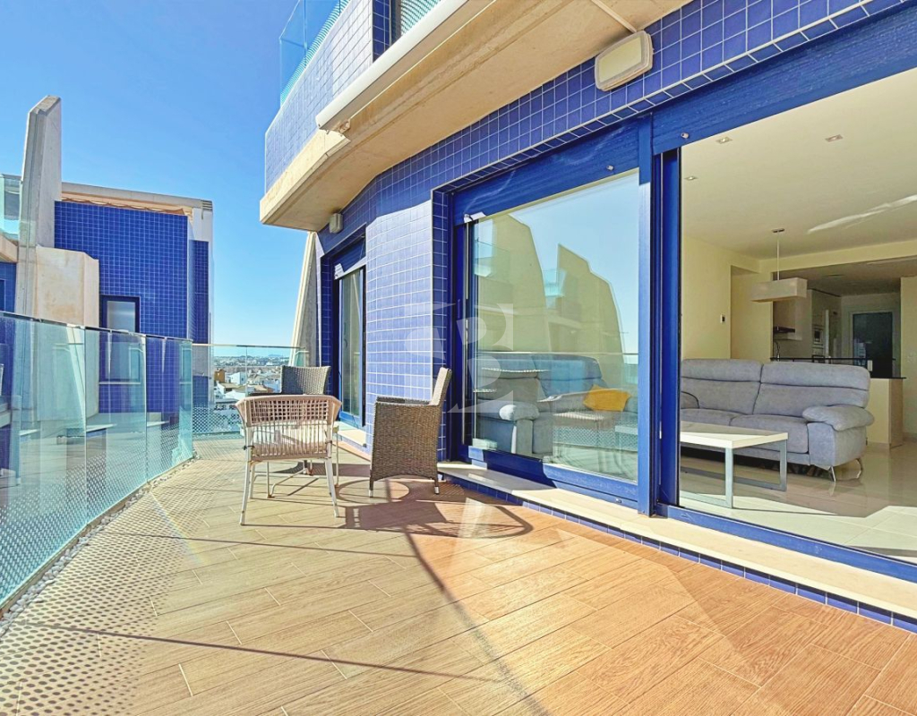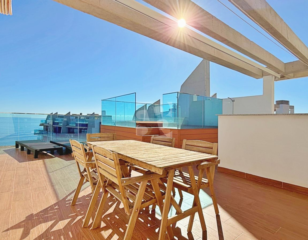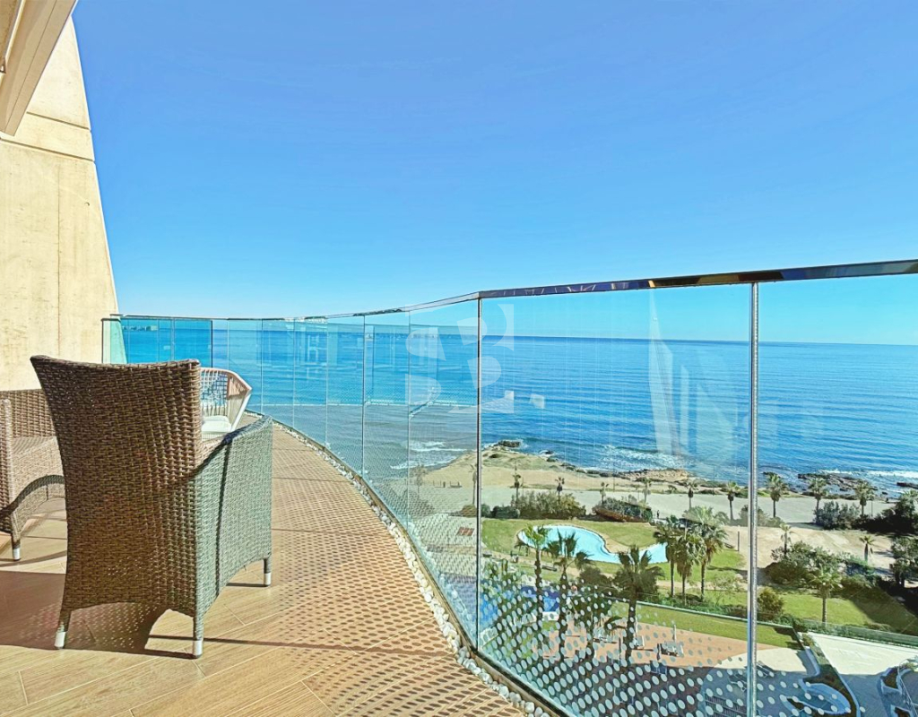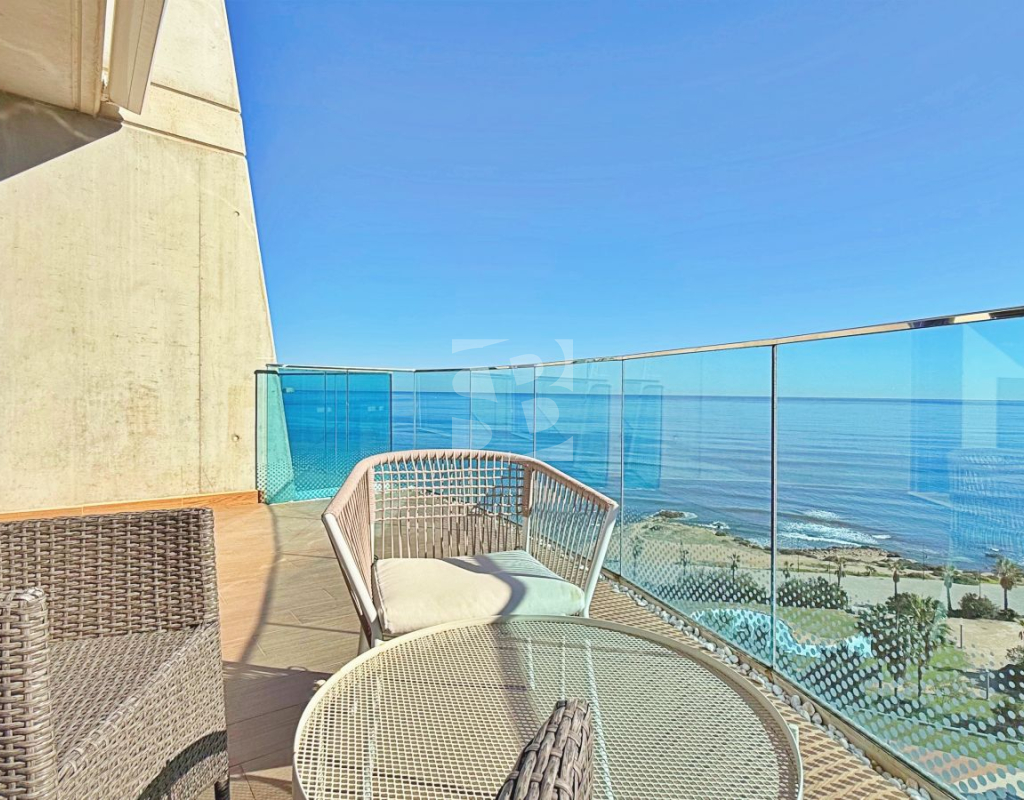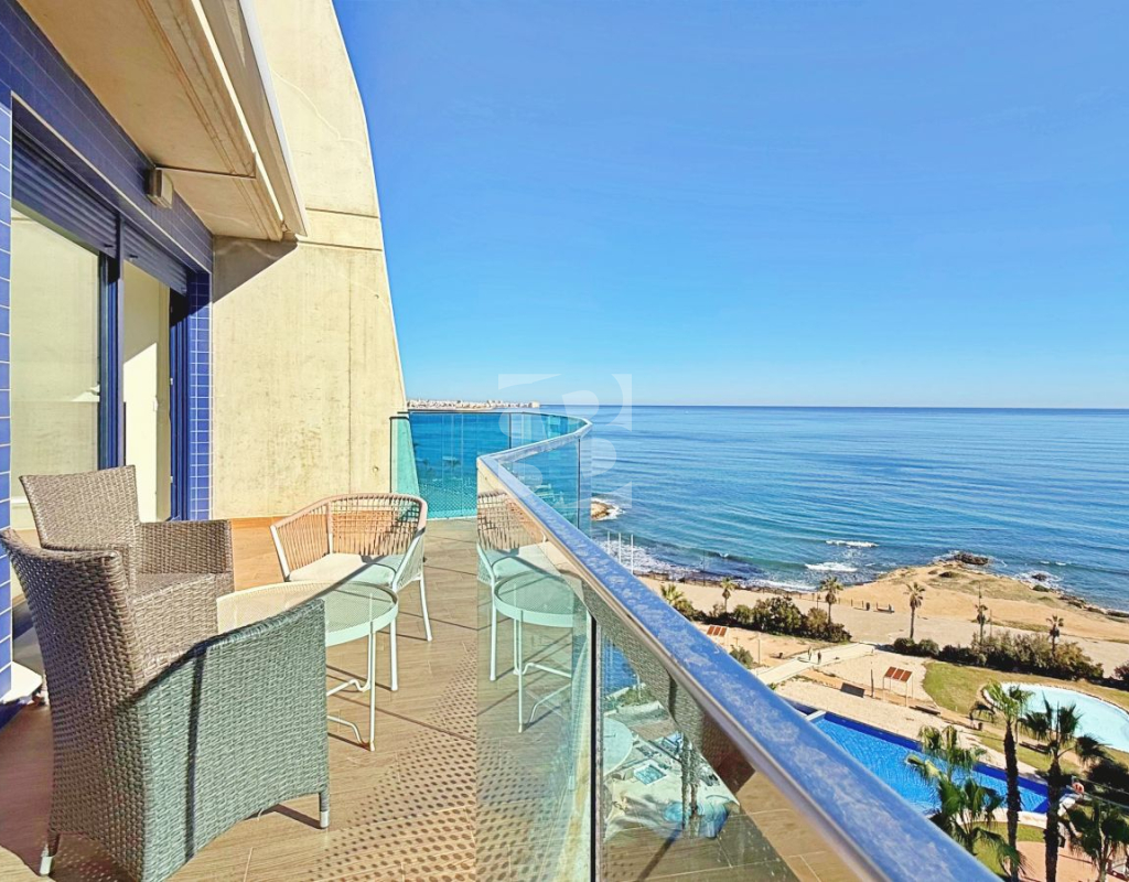 We present this stunning luxury penthouse located in the exclusive Sea Senses residential complex, one of the most sought-after developments in Punta Prima. With an unbeatable southeast orientation and panoramic views of the Mediterranean, this property offers a privileged seaside lifestyle. The property features 2 bedrooms and 2 bathrooms, designed in a modern and functional layout to ensure maximum comfort. From the bright living room, you access a charming 12 m² terrace, perfect for enjoying the sunrise and the sea breeze. The highlight of this penthouse is its spectacular private 83 m² solarium, equipped with a jacuzzi and relaxation areas—an authentic private oasis with endless sea views, ideal for enjoying the Mediterranean climate all year round. The property includes an underground parking space and a storage room, adding convenience and extra storage capacity. Sea Senses is one of the most prestigious residential complexes on the Costa Blanca South, offering top-class communal areas with infinity pools facing the sea, a gym, spa, jacuzzis, sports courts, and landscaped spaces. A setting designed to provide privacy, luxury, and well-being. Located in the renowned area of Punta Prima, this penthouse is just a few steps from the beach and surrounded by year-round services: supermarkets, restaurants, cafés, public transport, and leisure areas. It is also close to shopping centres such as Zenia Boulevard, prestigious golf courses, and main connections to Torrevieja and Orihuela Costa. A truly unique home, where exclusivity, comfort, and sea views come together to offer an unparalleled living experience.