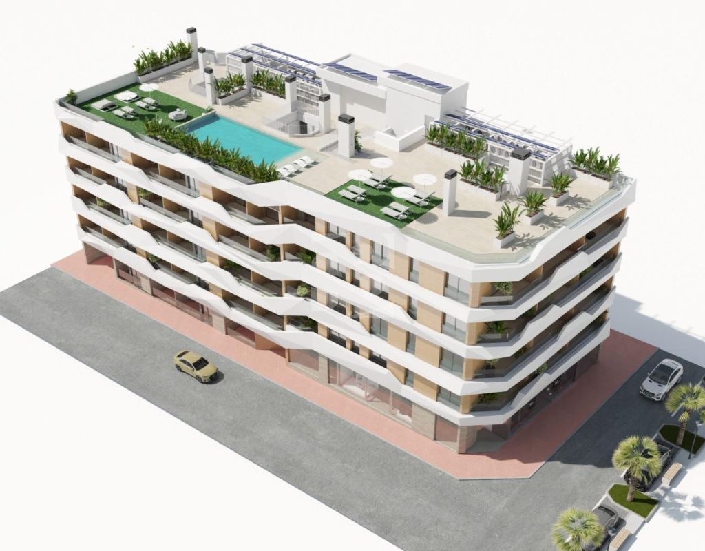 NOUVELLES CONSTRUCTIONS RÉSIDENTIELLES À GUARDAMAR DEL SEGURA Nouvelle construction résidentielle d'appartements et de penthouses à Guardamar del Segura. Ce bâtiment exceptionnel est le choix idéal grâce à sa proximité avec la plage et une large gamme de services. Ses installations comprendront une piscine et un solarium sur le toit, offrant aux résidents un espace de détente et de plaisir. Propriétés modernes avec 2 et 3 chambres, 2 salles de bains, un salon-salle à manger lumineux avec cuisine intégrée et une terrasse accueillante. Toutes les propriétés seront équipées de l'air conditionné et de la domotique, ce qui permettra aux résidents de contrôler et d'automatiser divers aspects de la maison, pour plus de confort et d'efficacité énergétique. La cuisine sera équipée d'appareils électroménagers de haute qualité, notamment un four, un lave-vaisselle, un réfrigérateur-congélateur, une hotte aspirante et une plaque de cuisson à induction, garantissant un espace fonctionnel et moderne pour cuisiner et apprécier les repas en compagnie. En outre, il est possible d'acheter une place de parking et un local de rangement dans le même immeuble, ce qui offre plus de commodité et d'espace de rangement aux résidents. La résidence est située dans un endroit privilégié, à proximité de la plage et entourée d'une grande variété de services et d'équipements, tels que des restaurants, des magasins, des supermarchés et des zones de loisirs. Guardamar del Segura, connu pour ses belles plages de sable fin et son environnement naturel, offre un style de vie calme et détendu, sans renoncer aux facilités nécessaires à portée de main.