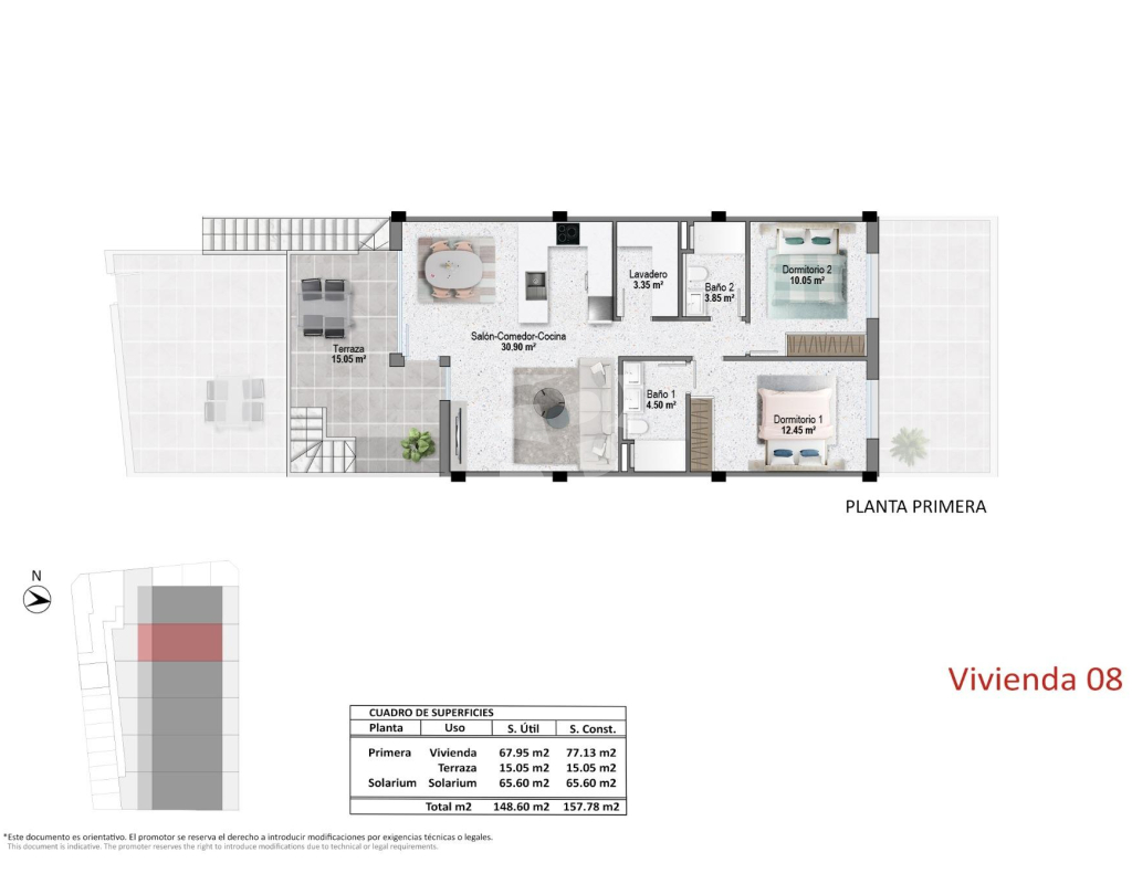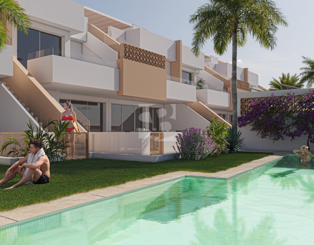 Bungalows neufs à Pilar de la Horadada Près de la plage et du centre-ville Une vie contemporaine au cœur de la Costa Blanca Bienvenue dans un complexe résidentiel de 12 bungalows neufs situé à Pilar de la Horadada, une ville côtière animée à l'extrémité sud de la Costa Blanca. Cet emplacement privilégié offre le mélange parfait entre la tranquillité de la vie méditerranéenne et la commodité, avec tous les services essentiels, magasins, restaurants et commodités accessibles à pied. Les magnifiques plages de sable de Torre de la Horadada et Mil Palmeras sont à seulement 3 km, idéales pour des journées de détente à la plage ou pour pratiquer des sports nautiques. Choix de bungalows au rez-de-chaussée ou au dernier étage Ce développement exclusif propose deux types de maisons modernes adaptées à votre style de vie : Des bungalows au rez-de-chaussée avec 3 chambres, 2 salles de bains et de grandes terrasses privées à l'avant et à l'arrière avec accès direct à la piscine et aux jardins communs. Les bungalows du dernier étage disposent de 2 chambres, de 2 salles de bain et d'un vaste solarium privé sur le toit, avec une cuisine d'été, une pergola et des toilettes pour invités. Toutes les maisons disposent d'espaces de vie lumineux et ouverts, de cuisines entièrement équipées, de la climatisation par conduits et d'un parking privé. Les chambres sont équipées d'armoires encastrées et les salles de bains bénéficient d'un chauffage par le sol pour plus de confort. Des équipements haut de gamme pour une vie méditerranéenne moderne Les maisons sont conçues avec des finitions de haute qualité et des caractéristiques pratiques, notamment : Porte d'entrée blindée avec finition en aluminium Volets électriques dans le salon et les chambres Système d'eau chaude aérothermique Appareils de cuisine BALAY ou équivalent Solariums sur le toit avec gazon artificiel, douche extérieure, éclairage et cuisine d'été complète avec lave-vaisselle, petit réfrigérateur, plaque à induction et hotte aspirante. Emplacement stratégique avec une excellente connectivité Pilar de la Horadada est bien relié aux principaux points d'intérêt de la Costa Blanca et de la Costa Cálida : Plages (Torre de la Horadada / Mil Palmeras) - 3 km Parcours de golf Lo Romero - 6 km Aéroport de Corvera (Murcie) - 40 km Aéroport d'Alicante - 55 km Centre commercial Zenia Boulevard - 14 km Port de plaisance de San Pedro del Pinatar – 11 km Votre maison idéale au soleil Que vous soyez à la recherche d'une escapade de vacances, d'une résidence à l'année ou d'un investissement locatif, ces bungalows à Pilar de la Horadada offrent un excellent rapport qualité-prix dans l'une des villes les plus prisées de la Costa Blanca. Contactez-nous dès aujourd'hui pour organiser une visite ou demander plus d'informations !