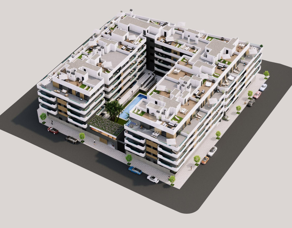 NOUVEAU COMPLEXE RÉSIDENTIEL A SANTA POLA Nouveau complexe résidentiel moderne fermé comprenant des appartements et des penthouses de 1, 2 et 3 chambres à coucher avec 2 salles de bains complètes. Le complexe se compose de 4 escaliers d'appartements avec de vastes espaces communs paysagers, y compris une piscine, un espace de détente et un gymnase. Toutes les propriétés ont été soigneusement conçues pour vous offrir une expérience de vie exceptionnelle, avec des finitions de haute qualité et un style moderne. Profitez des vastes terrasses, où vous pourrez vous détendre, manger en plein air et admirer les couchers de soleil les plus spectaculaires. L'emplacement est tout simplement imbattable : à côté du centre de Santa Pola et de la palmeraie, et à seulement quelques minutes de la promenade, vous serez à proximité d'un large éventail de restaurants, de bars et de supermarchés. Excellente connexion avec la route nationale 332, qui relie tout le sud de la Costa Blanca, et avec l'aéroport en seulement 15 minutes.
