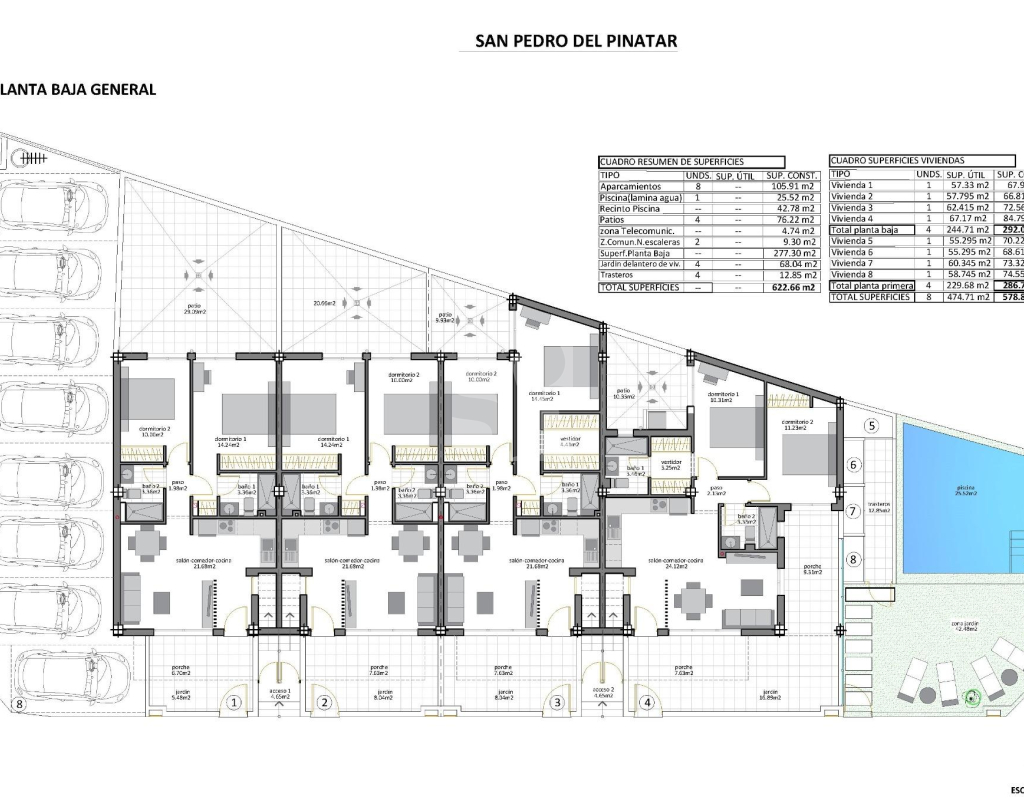 Bungalows nouvellement construits à San Pedro del Pinatar - Situation privilégiée à 500 m de la plage Maisons exclusives de style boutique près de la côte Découvrez ces élégants bungalows neufs au cœur de San Pedro del Pinatar, à seulement 500 mètres des superbes plages de la Mar Menor. Ce lotissement de charme ne comprend que huit maisons caractéristiques, alliant design moderne, confort et mode de vie côtier paisible. Modèles disponibles pour s'adapter à votre style de vie Modèle rez-de-chaussée/jardin : Ce modèle comprend une terrasse à l'avant et un patio spacieux à l'arrière, parfaits pour vivre à l'extérieur. Modèle Penthouse Loft : Comprend un solarium privé sur le toit et une terrasse avant, offrant des vues dégagées et une abondance de lumière. Détails du modèle rez-de-chaussée/jardin Entrez dans un espace de vie lumineux qui se connecte de manière transparente à la salle à manger et à une cuisine entièrement équipée. De grandes portes coulissantes en verre laissent entrer la lumière naturelle, créant une ambiance ouverte et accueillante. L'aménagement comprend deux chambres spacieuses, dont la chambre principale dotée d'une salle de bains attenante, ainsi qu'une salle de bains familiale moderne. Points forts du modèle Penthouse L'accès au penthouse se fait par un escalier privé menant à une grande terrasse. À l'intérieur, un salon et une salle à manger ouverts se mêlent à une cuisine entièrement équipée. Deux chambres à coucher sont incluses, la chambre principale disposant d'une salle de bains attenante. Un solarium privé sur le toit, accessible depuis la cuisine, constitue un endroit idéal pour se détendre ou se divertir. Des rangements supplémentaires au rez-de-chaussée assurent la commodité de l'ensemble. Principales caractéristiques et commodités Éclairage LED intérieur et extérieur. Cuisine entièrement équipée avec plaque de cuisson à induction, four, lave-vaisselle et réfrigérateur/congélateur. Climatisation installée. Place de parking réservée. Jardin commun paysager avec piscine pour les résidents. San Pedro del Pinatar : charme côtier et commodité Situé sur les magnifiques côtes de la Mar Menor et de la Méditerranée, San Pedro del Pinatar est un paradis pour les amateurs de sports nautiques, de voile et de plage. La région voisine de Lo Pagán offre des bains de boue naturels, des eaux calmes et des services tout au long de l'année, notamment des boutiques, des restaurants et des installations de loisirs. Distances des principaux centres d'intérêt : Centre commercial Dos Mares : Centre commercial Dos Mares : 5 km Aéroport de Murcia/Corvera : 30 km Aéroport d'Alicante : 75 km Terrains de golf locaux : 10-20 km Marina et clubs de voile : 2 km Réservez votre maison de rêve dès aujourd'hui L'achèvement des travaux étant prévu pour la fin de l'année 2025, c'est le moment idéal pour réserver votre nouvelle maison à San Pedro del Pinatar. Ne manquez pas cette occasion de profiter d'un mélange d'élégance moderne et de tranquillité côtière. Contactez-nous dès aujourd'hui pour en savoir plus ou pour organiser une visite !