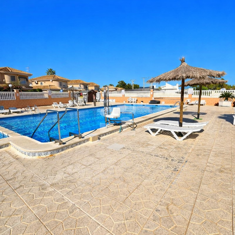 Ce logement chaleureux et bien entretenu comprend deux chambres, une salle de bains, une cuisine américaine moderne et une terrasse ensoleillée, idéale pour se détendre en plein air ou profiter d'un dîner au coucher du soleil. Un solarium privé offre un espace supplémentaire pour profiter du soleil et de la douceur du climat. Le bungalow fait partie d'un complexe avec piscine commune, parfaite pour se rafraîchir en été.