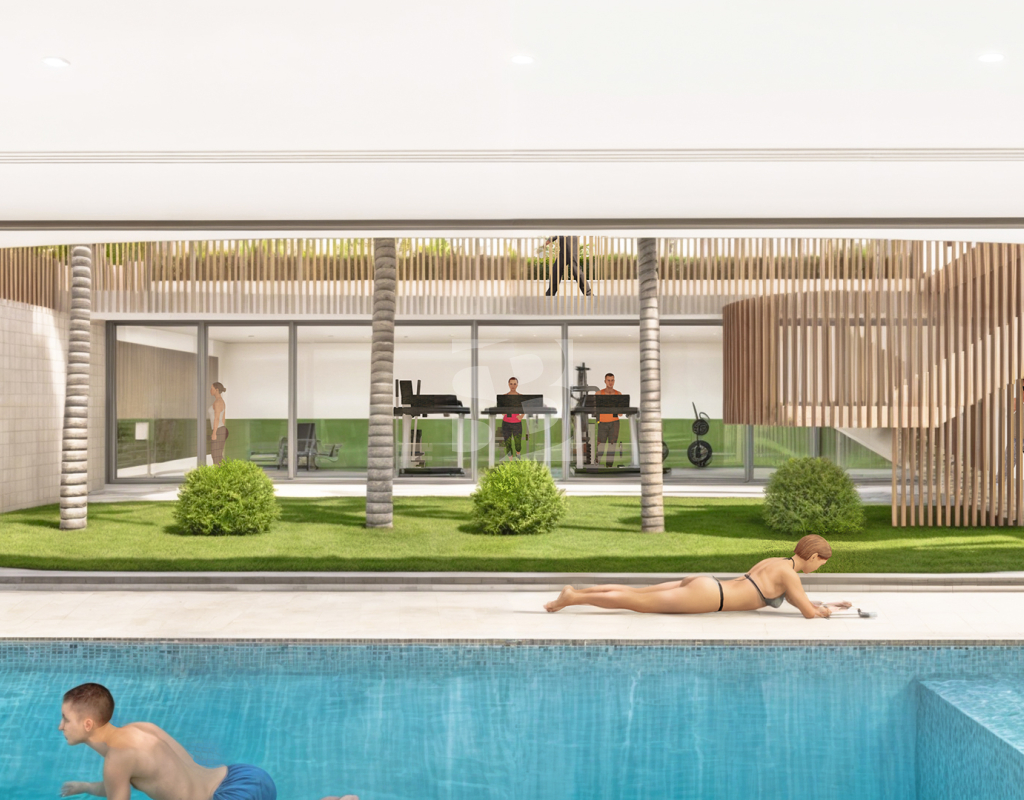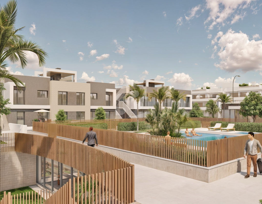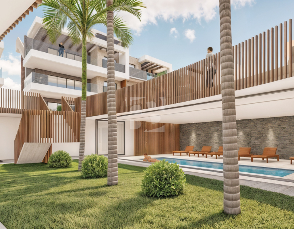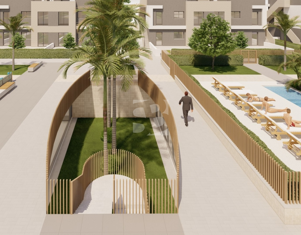 Este complejo consiste de 24 apartamentos localizados en 3 plantas. Los apartamentos de planta bajas llevan Jardín de 73m2 - 250m2, los de la segunda planta llevan teraza de 25m2, y los áticos llevan terraza de 22m2 y solarium de 72m2. Todos los apartamentos consisten de 3 dormitorios, 2 baños, cocina equipado, muebles, iluminación, aire acondicionado, plazo de garaje y trastero.