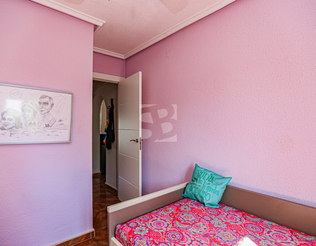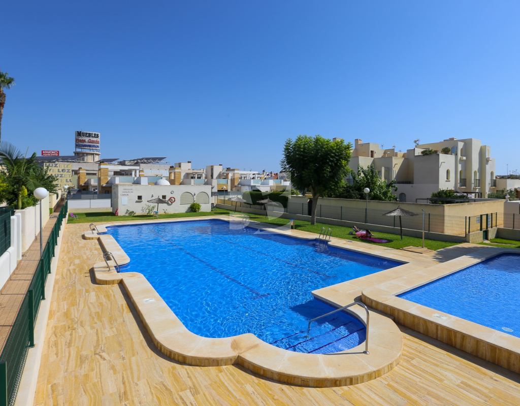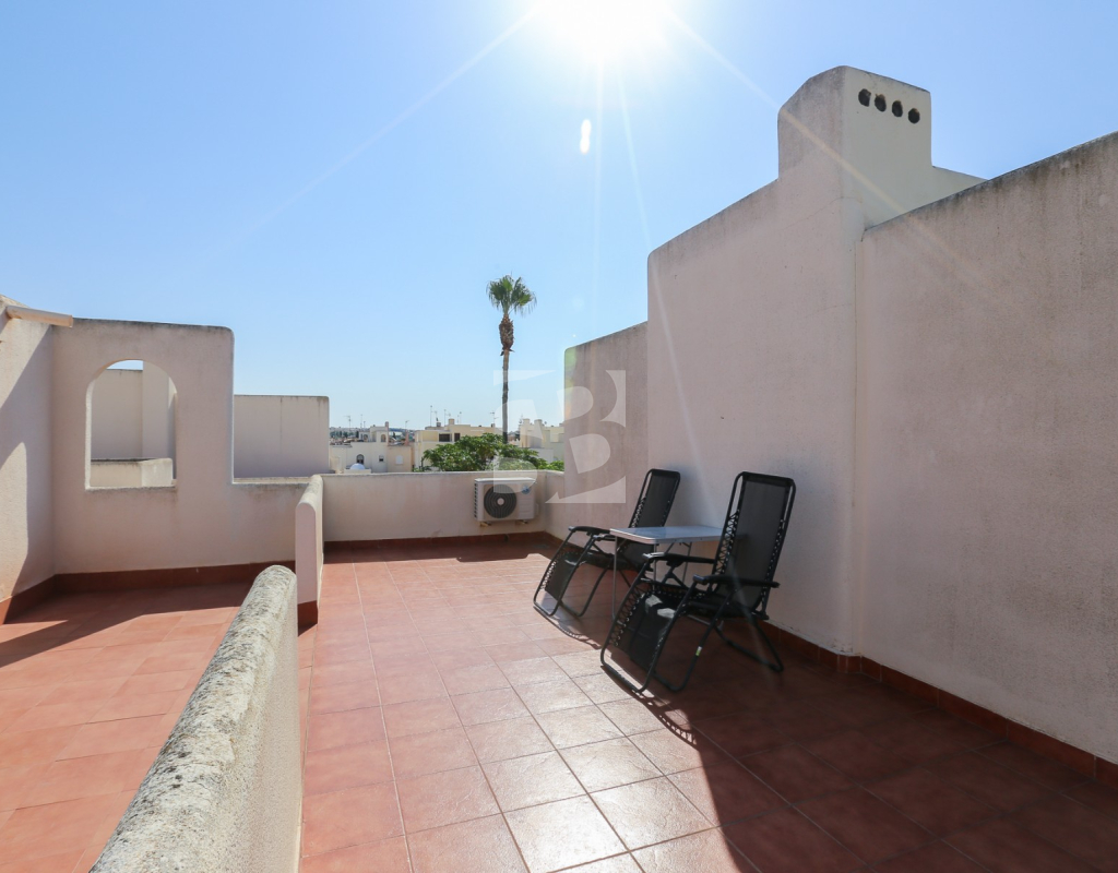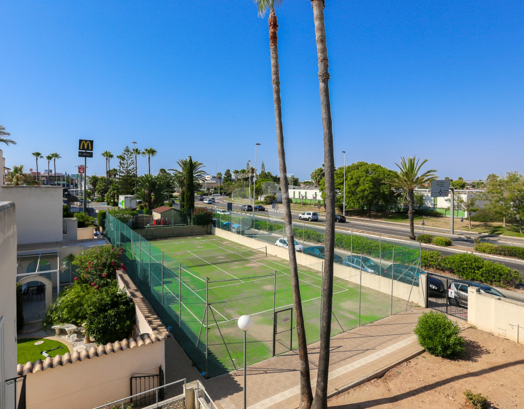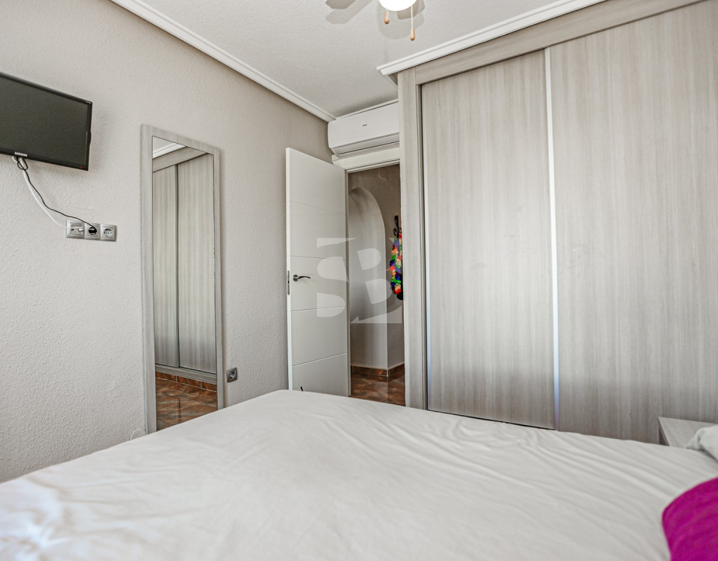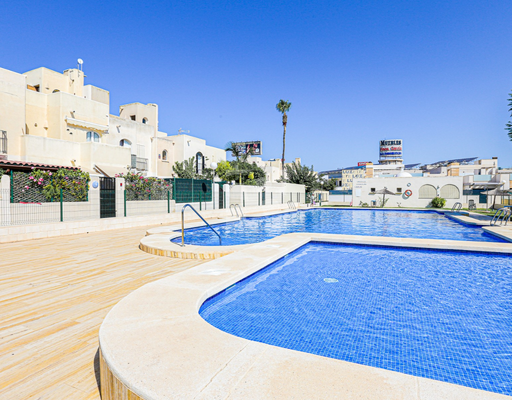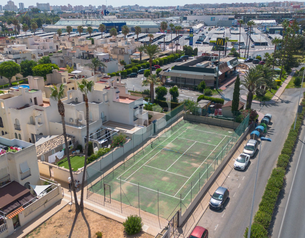 Junto a nuestra oficia ofrecemos este BUNGALOW PLANTA ALTA CON TERRAZA Y SOLÁRIUM situada en un residencial cerrado con excelentes zonas comunes, que incluyen una pista de tenis y una preciosa piscina comunitaria completamente renovada, con nuevos azulejos, vestuarios, duchas y baños. El acceso es a través de una escalera exterior que conduce a una vivienda cómoda y luminosa. Nada más entrar, encontramos un baño de invitados a mano derecha, seguido de un espacioso salón-comedor muy luminoso, ideal para disfrutar en familia. Desde el salón se accede a una terraza de 4 m² con toldo, perfecta para desayunos o cenas al aire libre. La vivienda cuenta con una cocina independiente totalmente equipada, y dispone de dos amplios dormitorios, uno de ellos con balcón francés. Además, se incluye un baño completo con ducha y un práctico trastero/despensa en la misma planta, ideal para almacenaje adicional. Entre las mejoras recientes destacan: ventanas nuevas, dos unidades de aire acondicionado, puertas interiores renovadas y otras actualizaciones que aportan confort y estilo. Como valor añadido, la propiedad cuenta con un solárium privado de 19 m², ideal para tomar el sol o relajarse, donde también se encuentra un trastero amplio independiente, perfecto para guardar mobiliario de terraza, bicicletas u otros enseres. Ubicada a escasa distancia del centro de Torrevieja, con supermercado, restaurantes, cine y servicios a pocos pasos, esta vivienda es ideal tanto como residencia habitual como para vacaciones.