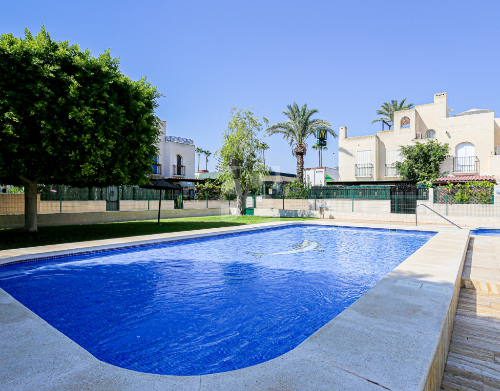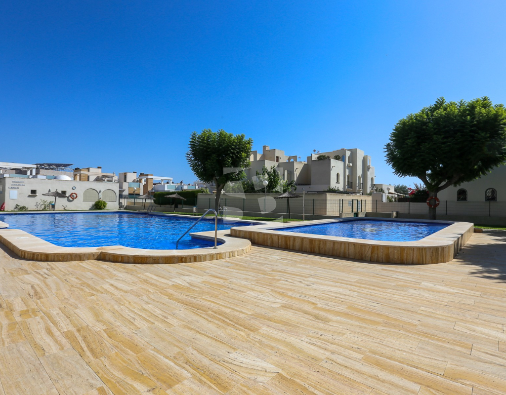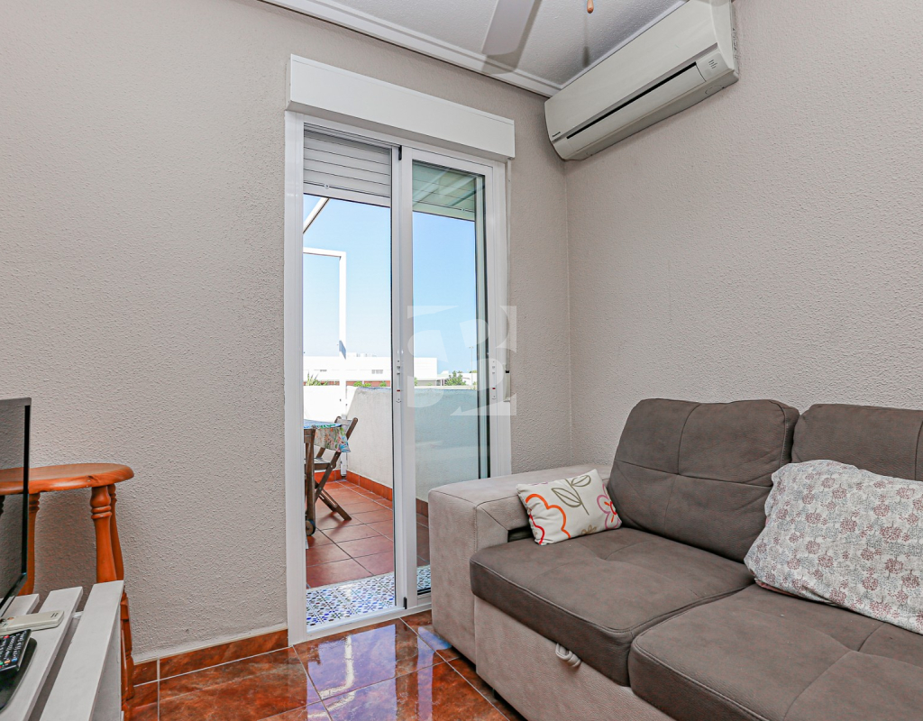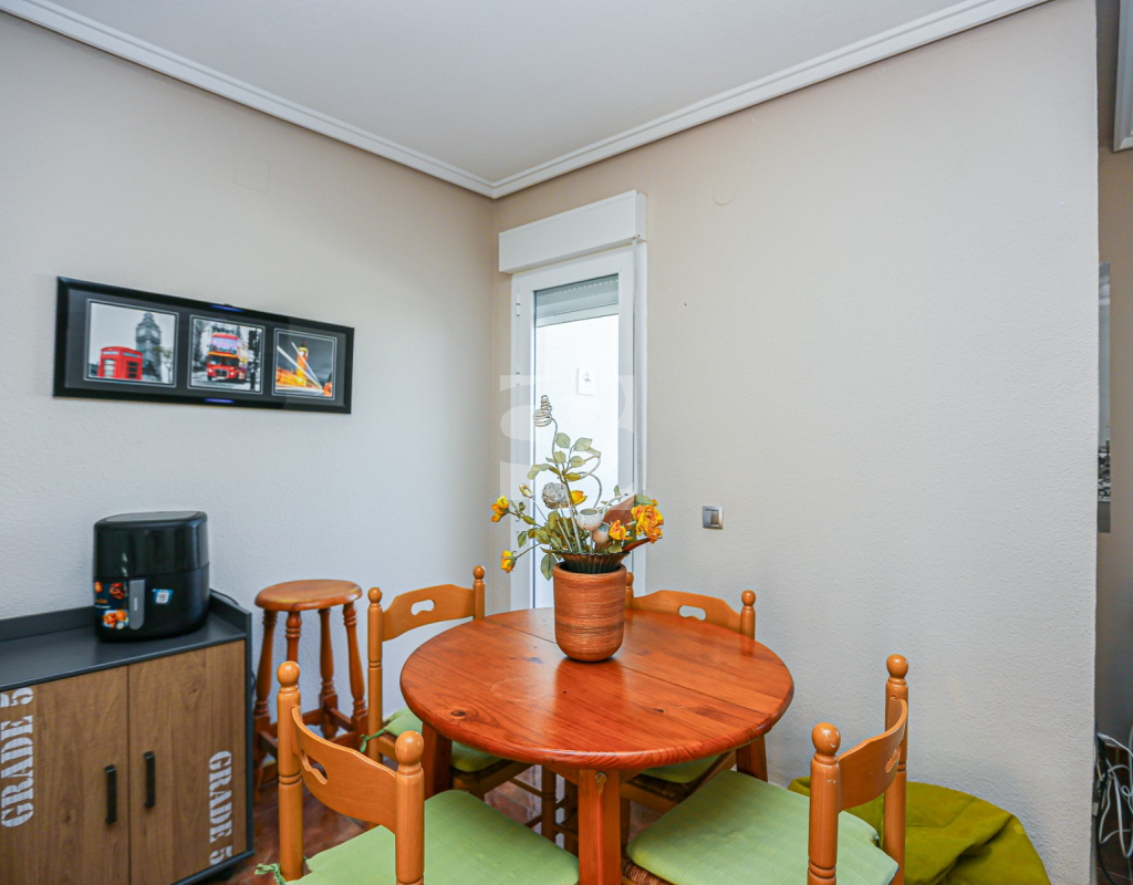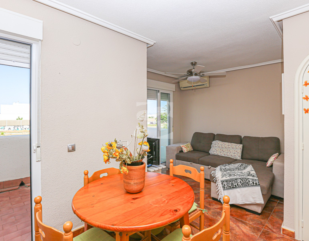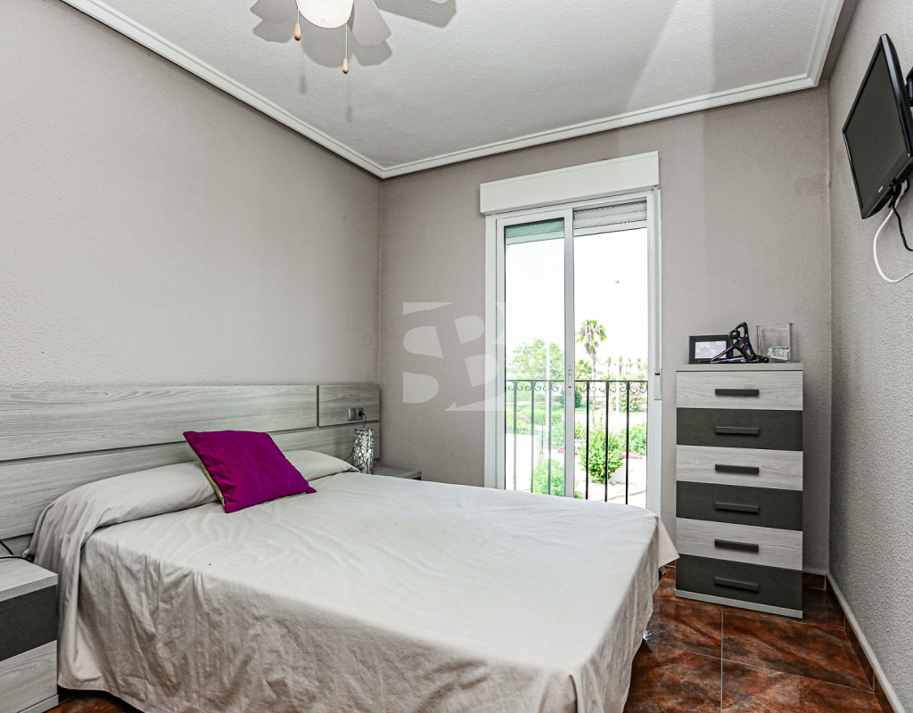 Junto a nuestra oficia ofrecemos este BUNGALOW PLANTA ALTA CON TERRAZA Y SOLÁRIUM situada en un residencial cerrado con excelentes zonas comunes, que incluyen una pista de tenis y una preciosa piscina comunitaria completamente renovada, con nuevos azulejos, vestuarios, duchas y baños. El acceso es a través de una escalera exterior que conduce a una vivienda cómoda y luminosa. Nada más entrar, encontramos un baño de invitados a mano derecha, seguido de un espacioso salón-comedor muy luminoso, ideal para disfrutar en familia. Desde el salón se accede a una terraza de 4 m² con toldo, perfecta para desayunos o cenas al aire libre. La vivienda cuenta con una cocina independiente totalmente equipada, y dispone de dos amplios dormitorios, uno de ellos con balcón francés. Además, se incluye un baño completo con ducha y un práctico trastero/despensa en la misma planta, ideal para almacenaje adicional. Entre las mejoras recientes destacan: ventanas nuevas, dos unidades de aire acondicionado, puertas interiores renovadas y otras actualizaciones que aportan confort y estilo. Como valor añadido, la propiedad cuenta con un solárium privado de 19 m², ideal para tomar el sol o relajarse, donde también se encuentra un trastero amplio independiente, perfecto para guardar mobiliario de terraza, bicicletas u otros enseres. Ubicada a escasa distancia del centro de Torrevieja, con supermercado, restaurantes, cine y servicios a pocos pasos, esta vivienda es ideal tanto como residencia habitual como para vacaciones.