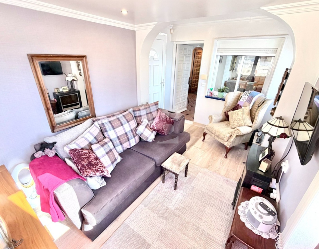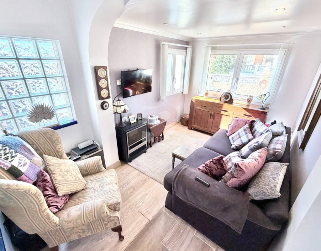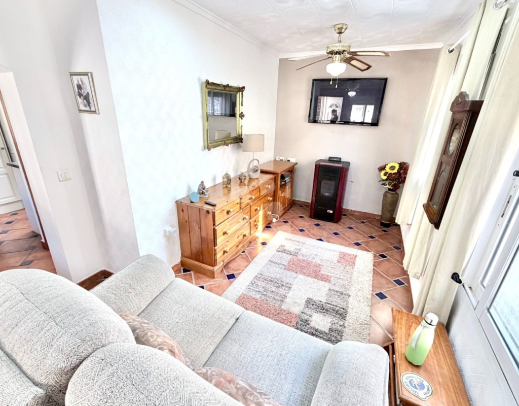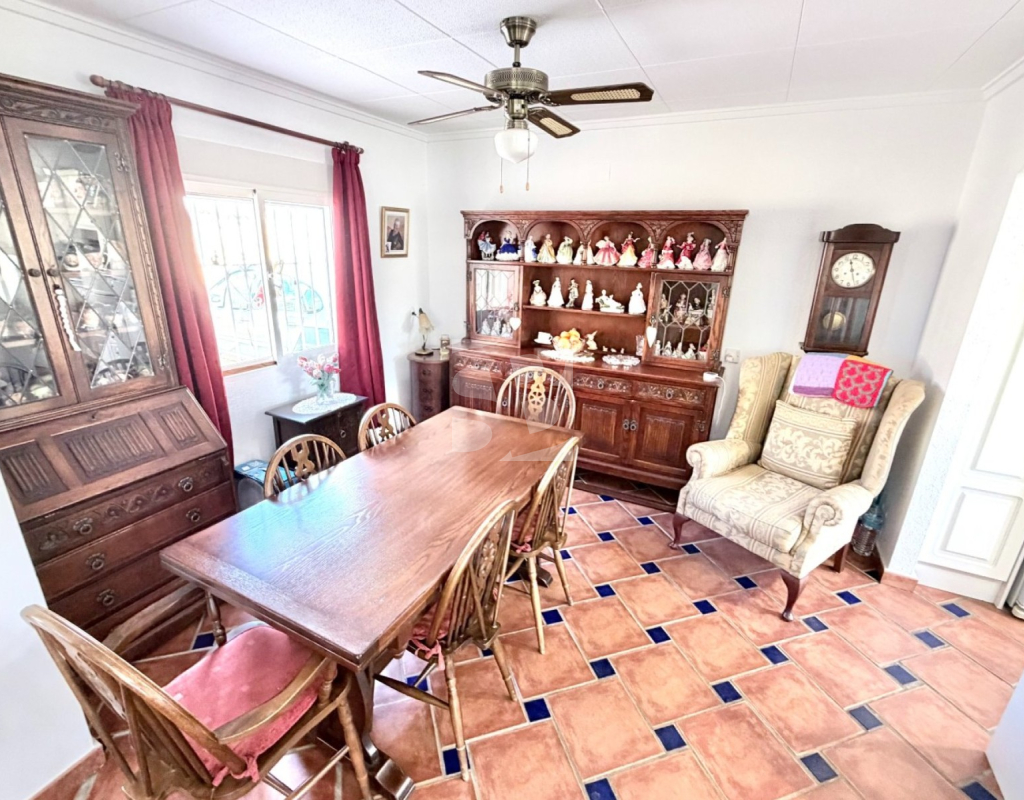 Al entrar por la puerta principal, se accede a un luminoso y acogedor salón que conecta de forma natural con el comedor, equipado con un ventilador de techo para mayor comodidad.
