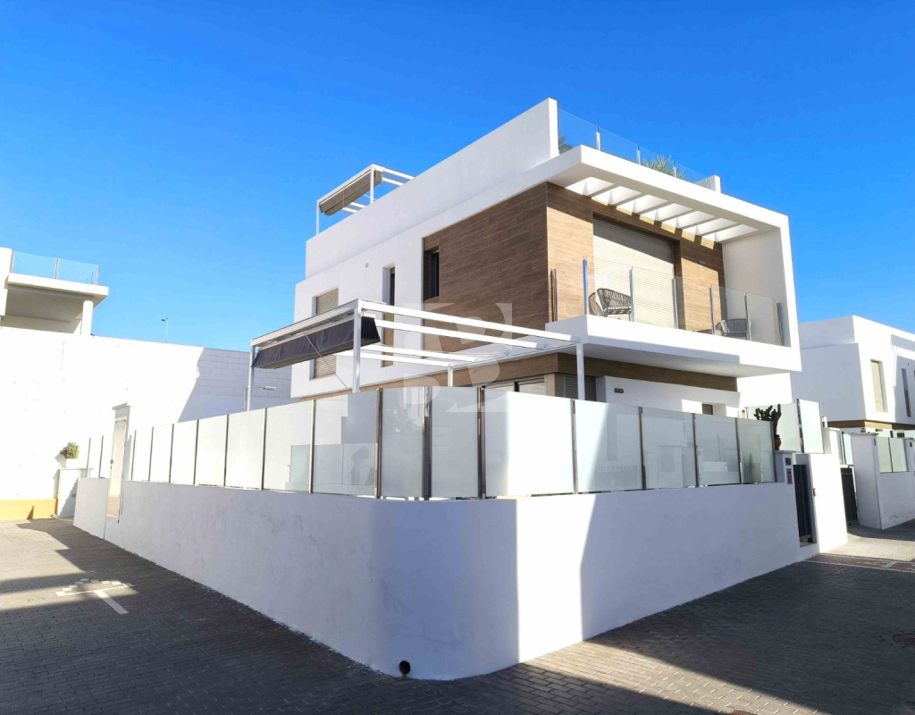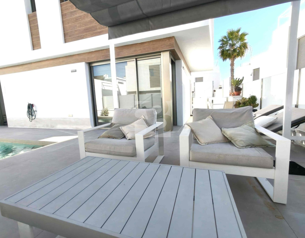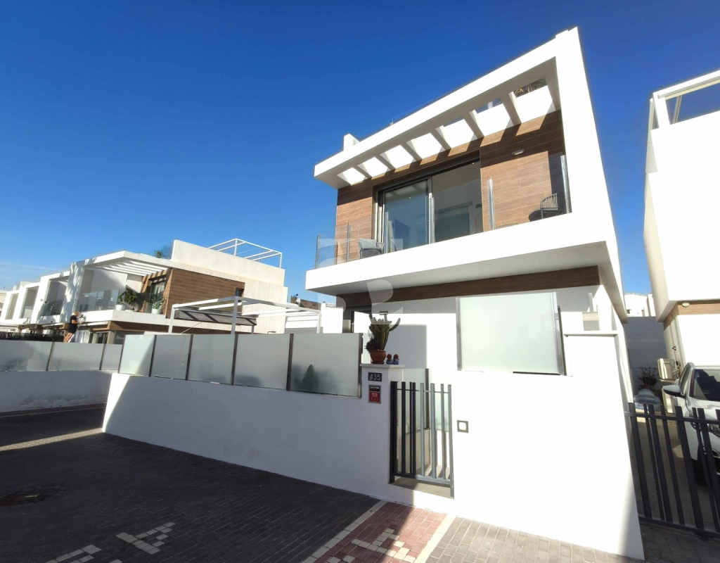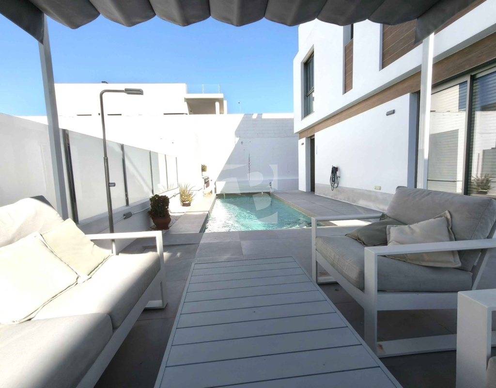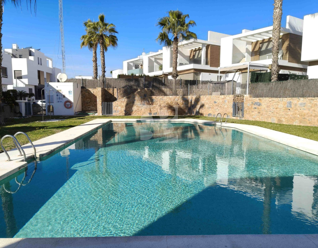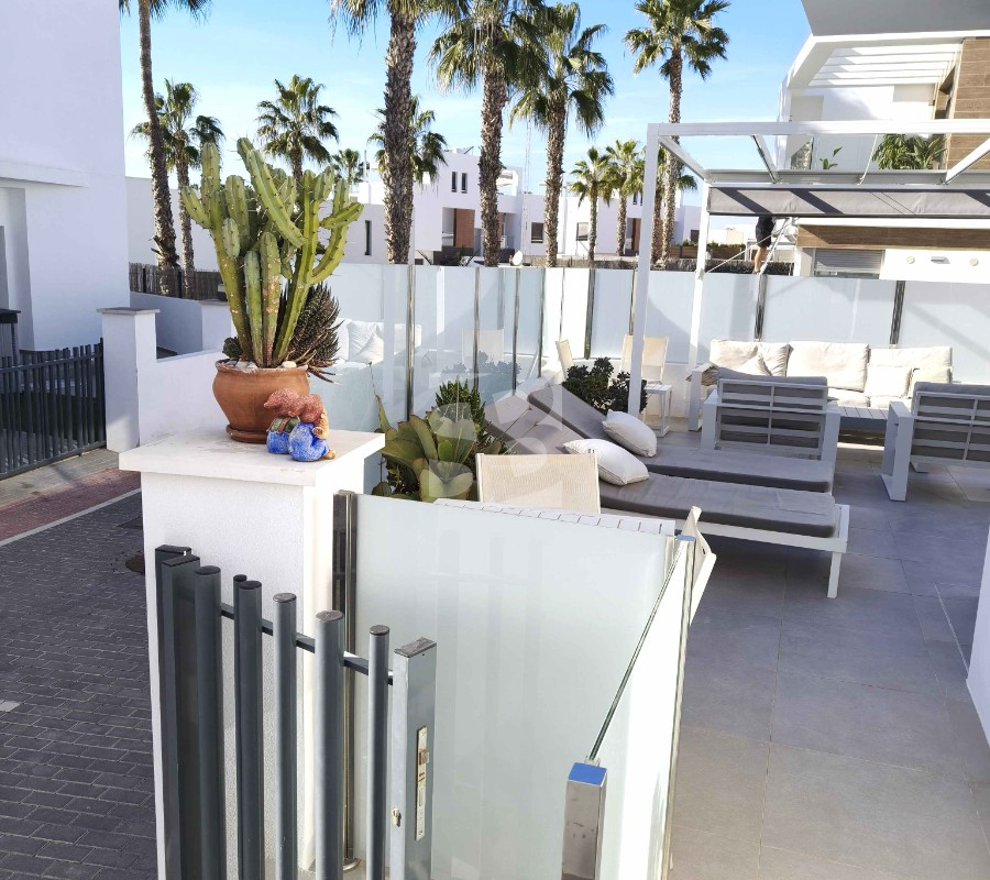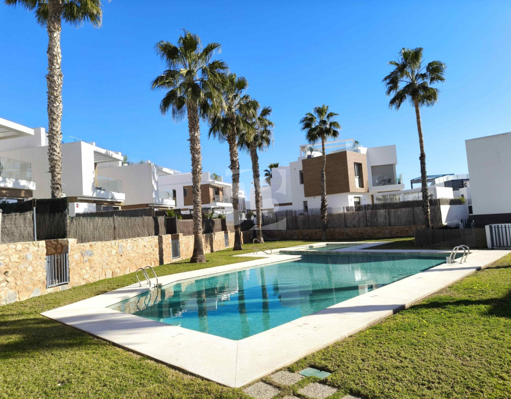 Ofrecemos esta preciosa vivienda en VILLAMARTÍN-ORIHUELA COSTA orientado al sur-este aprox. 195 m2 construidos de vivienda parcela de aprox. 300 m2 acceso para el coche a la parcela vivienda construida en 2019 consta de planta baja salón cocina completa con electrodomésticos 1 dormitorio en planta con acceso directo a piscina baño completo con ventana trastero y zona de lavadero.