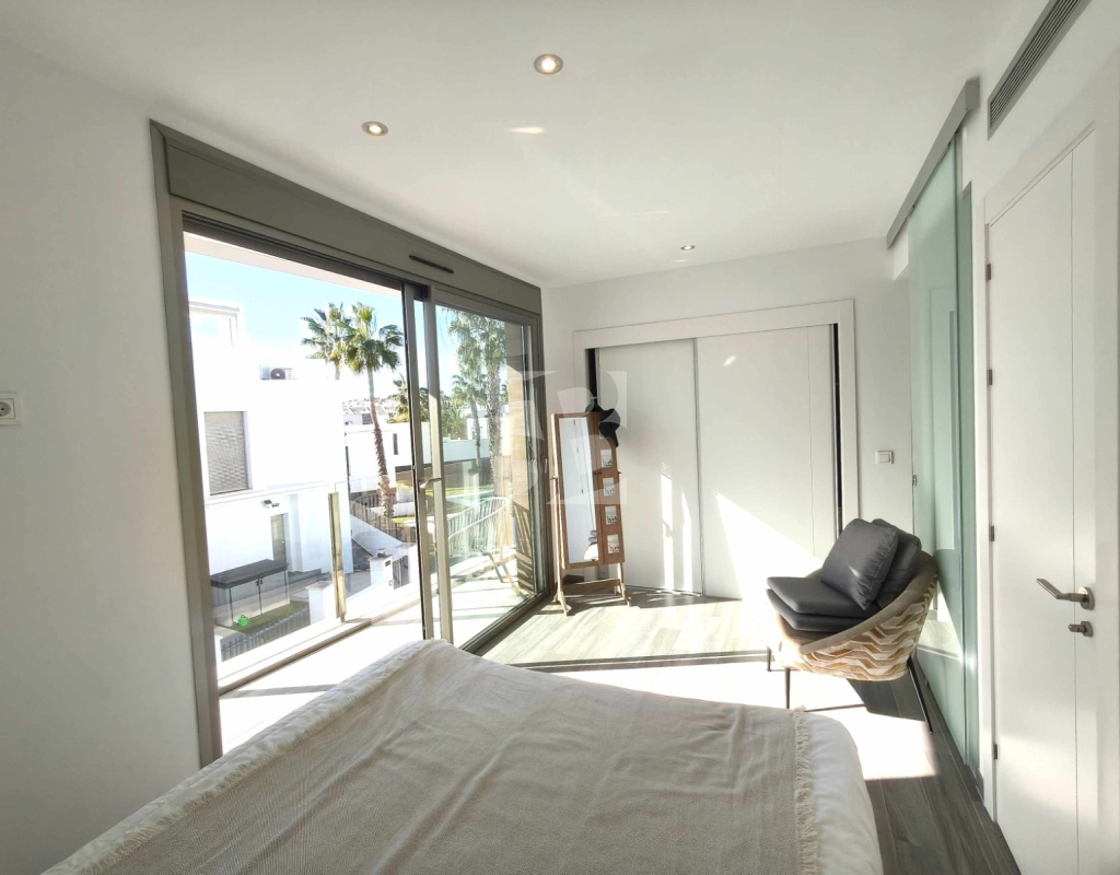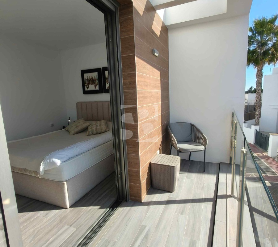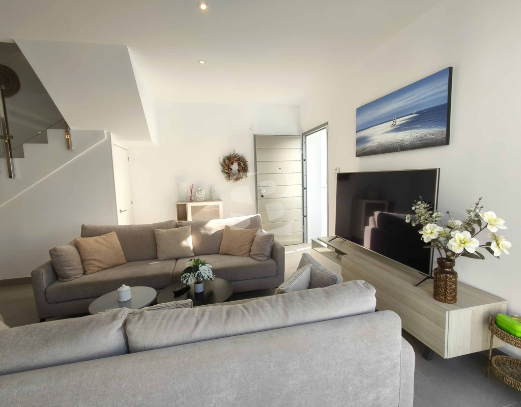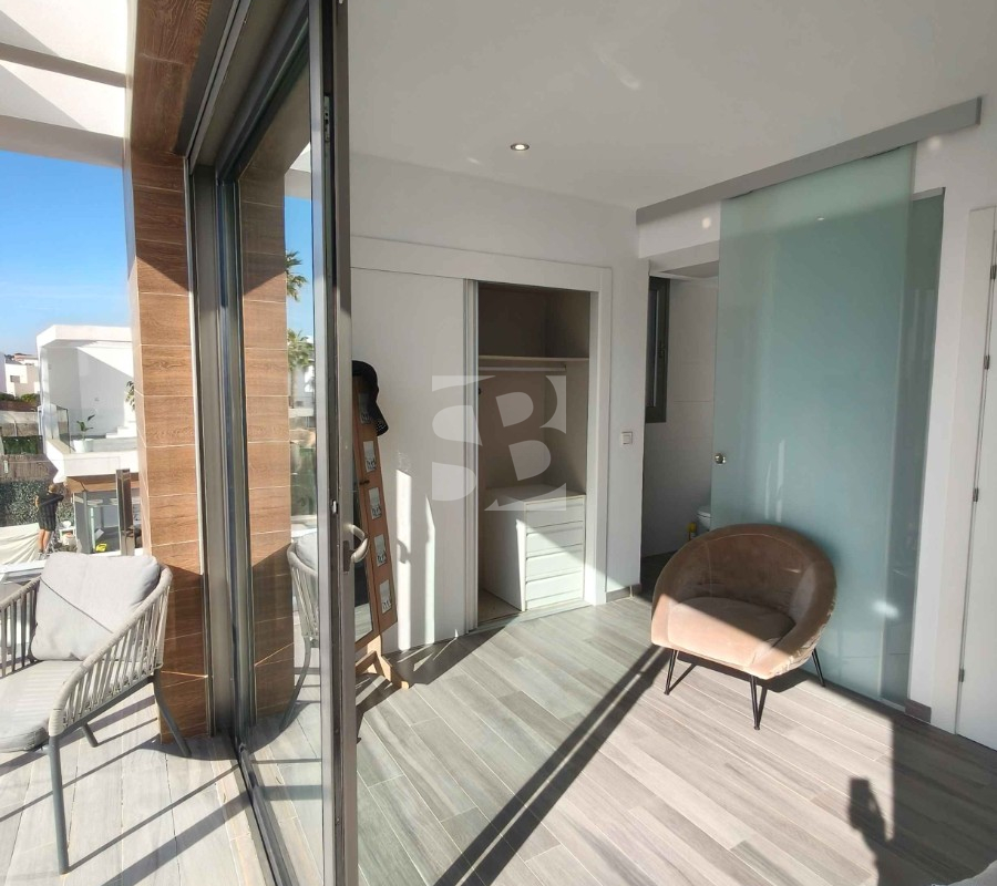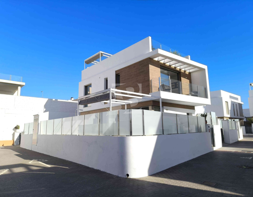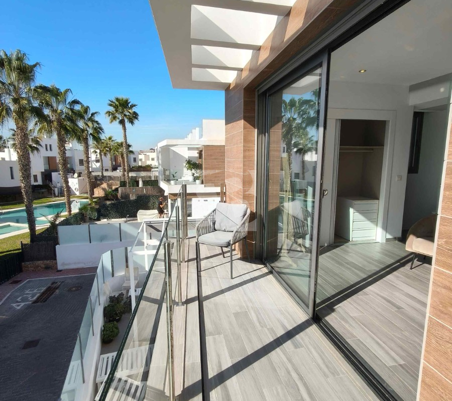 Ofrecemos esta preciosa vivienda en VILLAMARTÍN-ORIHUELA COSTA orientado al sur-este aprox. 195 m2 construidos de vivienda parcela de aprox. 300 m2 acceso para el coche a la parcela vivienda construida en 2019 consta de planta baja salón cocina completa con electrodomésticos 1 dormitorio en planta con acceso directo a piscina baño completo con ventana trastero y zona de lavadero.