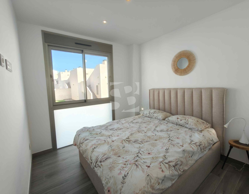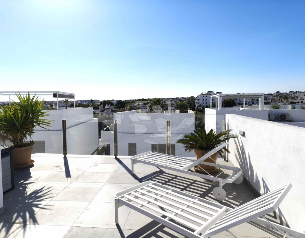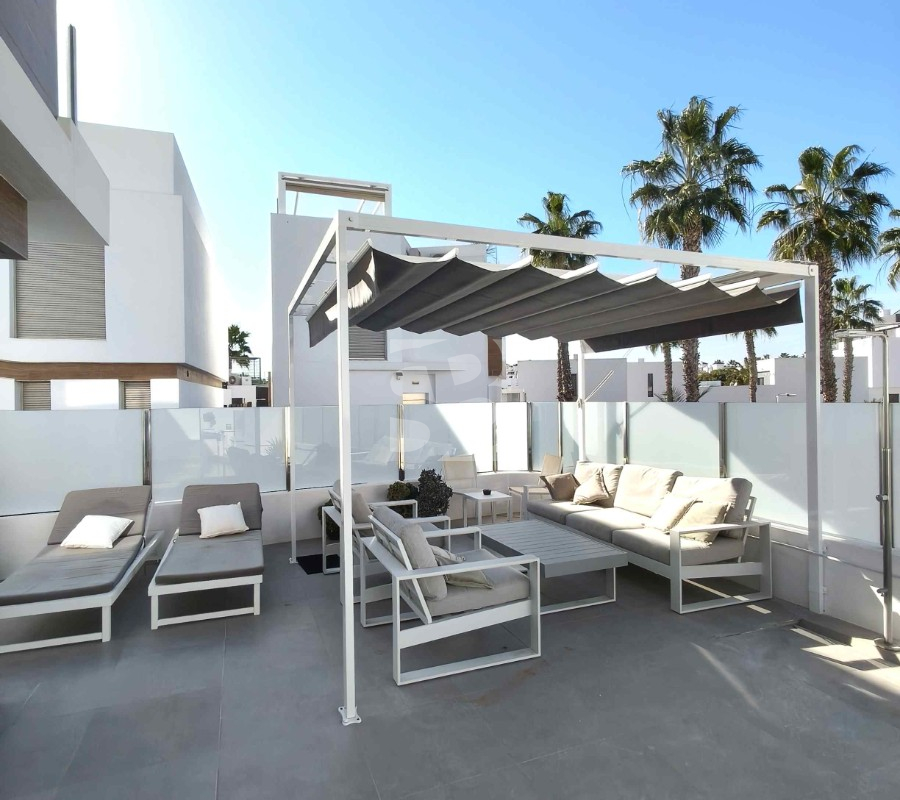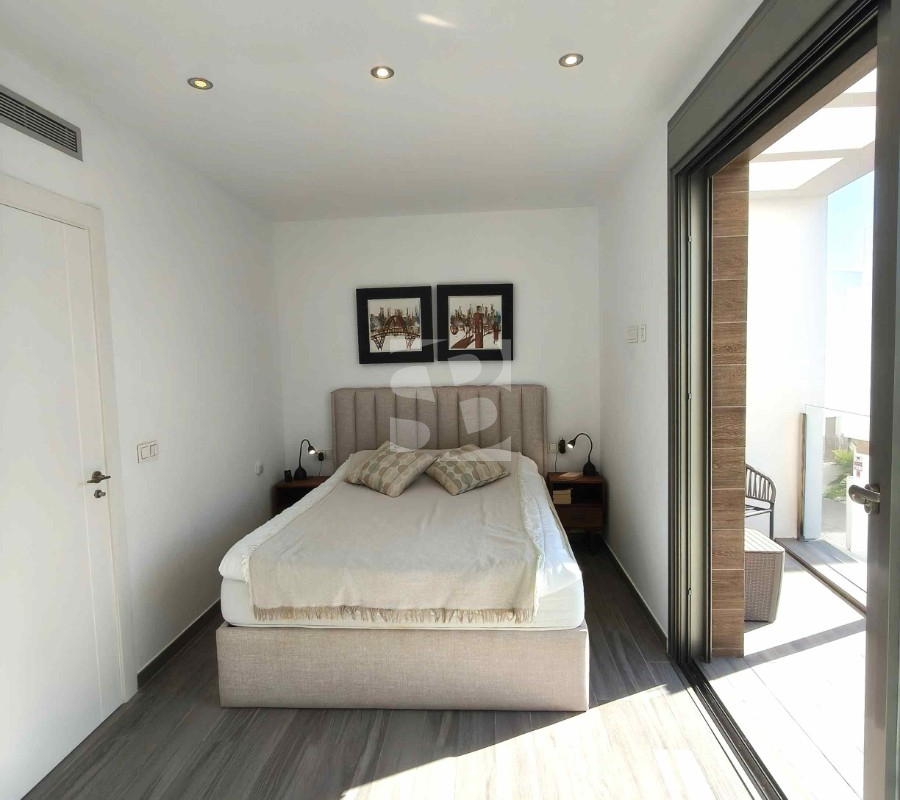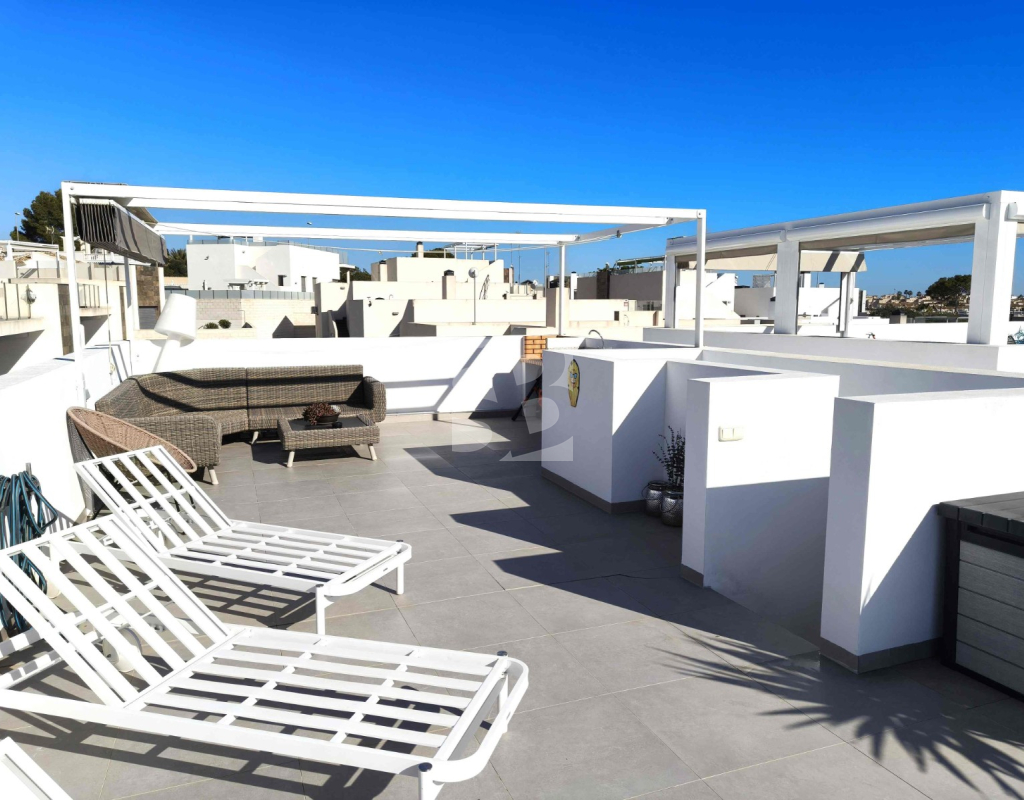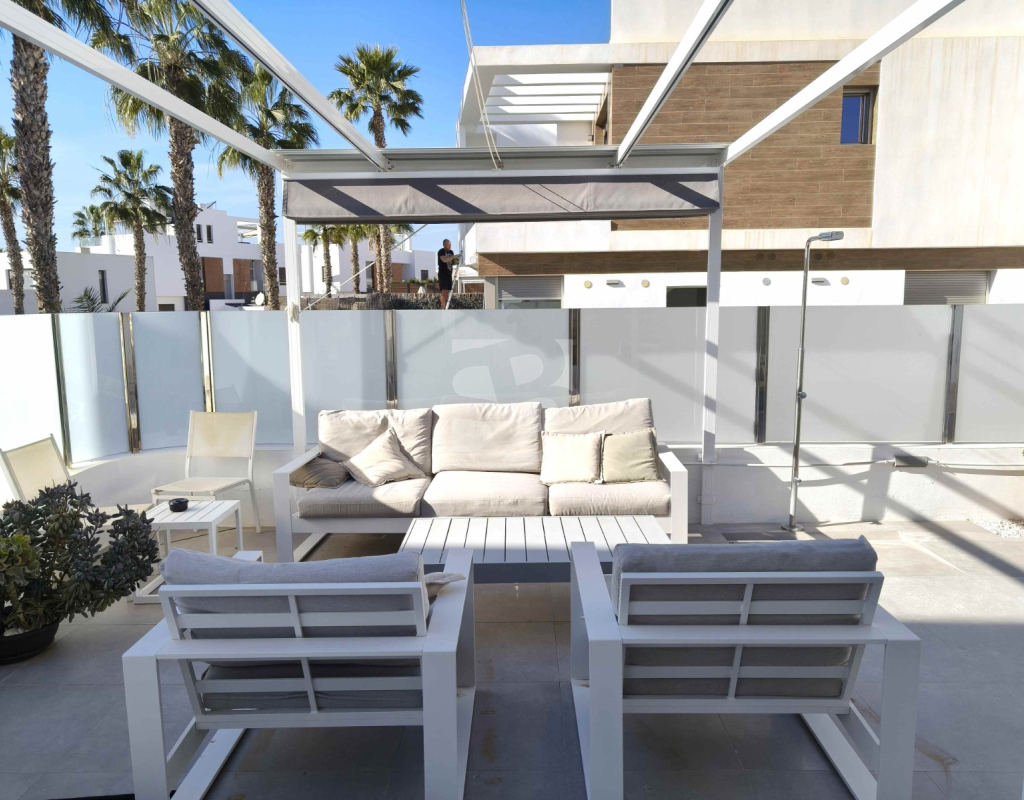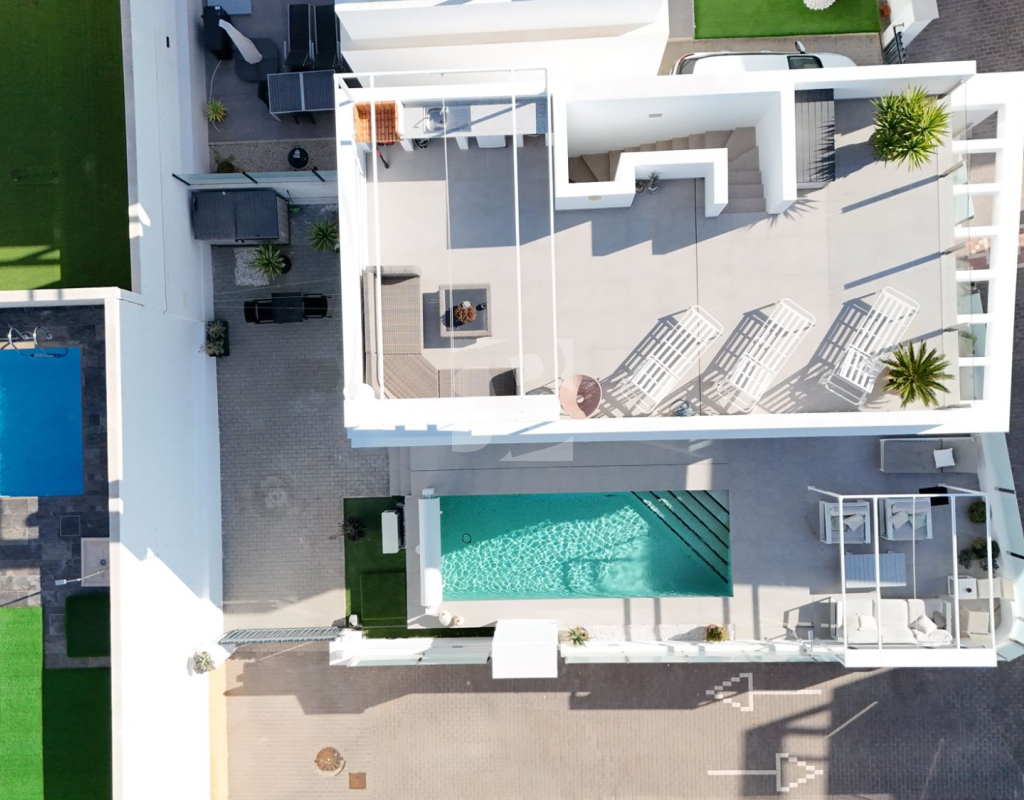 Ofrecemos esta preciosa vivienda en VILLAMARTÍN-ORIHUELA COSTA orientado al sur-este aprox. 195 m2 construidos de vivienda parcela de aprox. 300 m2 acceso para el coche a la parcela vivienda construida en 2019 consta de planta baja salón cocina completa con electrodomésticos 1 dormitorio en planta con acceso directo a piscina baño completo con ventana trastero y zona de lavadero.