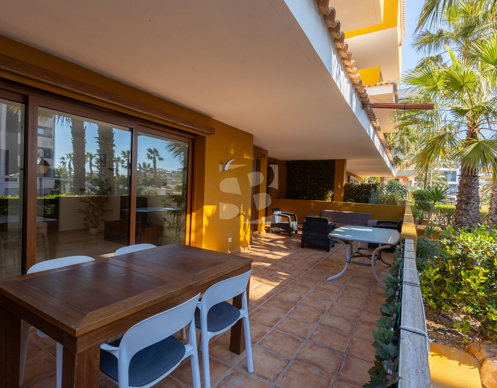 Este apartamento en planta baja en el residencial La Entrada, Punta Prima, destaca por su equilibrio entre privacidad y amplitud. Con 128 m² construidos, ofrece dos dormitorios, dos baños, cocina independiente y un salón luminoso. Su elemento diferenciador es la terraza privada de 40 m², un espacio excepcional para el estilo de vida mediterráneo.
