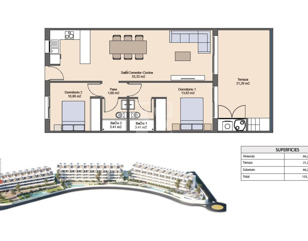 Эксклюзивные новые апартаменты с видом на море в Финестрате, Аликанте Превосходное расположение с панорамным видом на Бенидорм и Средиземное море Откройте для себя уникальный и роскошный новый жилой комплекс в Финестрате, Аликанте, предлагающий эксклюзивный образ жизни на побережье Коста-Бланка. Этот закрытый жилой комплекс состоит из 99 современных апартаментов с 2 спальнями и 2 ванными комнатами, расположенных всего в 2,3 км от пляжей Бенидорма, с захватывающим видом на Средиземное море и городской пейзаж. Комплекс расположен на возвышенности, в тихом природном окружении, но в то же время недалеко от оживленного центра Бенидорма. Финестрат — очень популярный район, который сочетает в себе спокойствие, природу и близость ко всем необходимым услугам. Премиум-удобства для средиземноморского стиля жизни Жилой комплекс, спроектированный с учетом комфорта и отдыха, включает в себя: Три общие бассейна для отдыха и развлечений Крытый и открытый тренажерные залы для любителей фитнеса Детская игровая площадка и корт для паддл-тенниса для семейного отдыха Ландшафтные зеленые зоны и пешеходные дорожки для спокойных прогулок Все апартаменты построены с использованием материалов и отделки высшего качества, таких как: Алюминиевые окна с тепловым мостом и двойным остеклением для энергоэффективности и шумоизоляции Светодиодное освещение во всем доме Меблированные ванные комнаты с зеркалами с подсветкой Бронированная входная дверь для максимальной безопасности Отличная транспортная доступность и услуги Комплекс предлагает отличное транспортное сообщение с ключевыми достопримечательностями: Международный аэропорт Аликанте – всего 55 км (около 40 минут на машине) Торговый центр La Marina – всего в 3 км, с магазинами, ресторанами и развлекательными заведениями Пляжи Леванте и Пониенте – менее 10 минут на машине Природный парк Пуч Кампана – идеальное место для пеших прогулок, велосипедных прогулок и активного отдыха Известные тематические парки, такие как Terra Mítica и Aqualandia – в пределах 5 км Рядом с ведущими медицинскими центрами, государственными и частными школами Современный дизайн и естественное освещение Каждый дом спроектирован так, чтобы максимально использовать естественное освещение благодаря большим окнам, из которых открывается потрясающий вид на Бенидорм и море. Интерьеры предлагают открытую планировку, функциональные пространства и превосходную теплоизоляцию для круглогодичного комфорта. Если вы ищете постоянное жилье, недвижимость для отдыха или выгодное вложение средств, этот новый комплекс в Финестрате предлагает сочетание спокойствия, роскоши и близости к оживленному городу Бенидорм. Обеспечьте себе недвижимость своей мечты на побережье Коста-Бланка Не упустите возможность стать владельцем красивой новой квартиры в одном из самых престижных районов Аликанте. Свяжитесь с нами сегодня, чтобы запросить дополнительную информацию, запланировать посещение или забронировать свой новый дом в Финестрате.